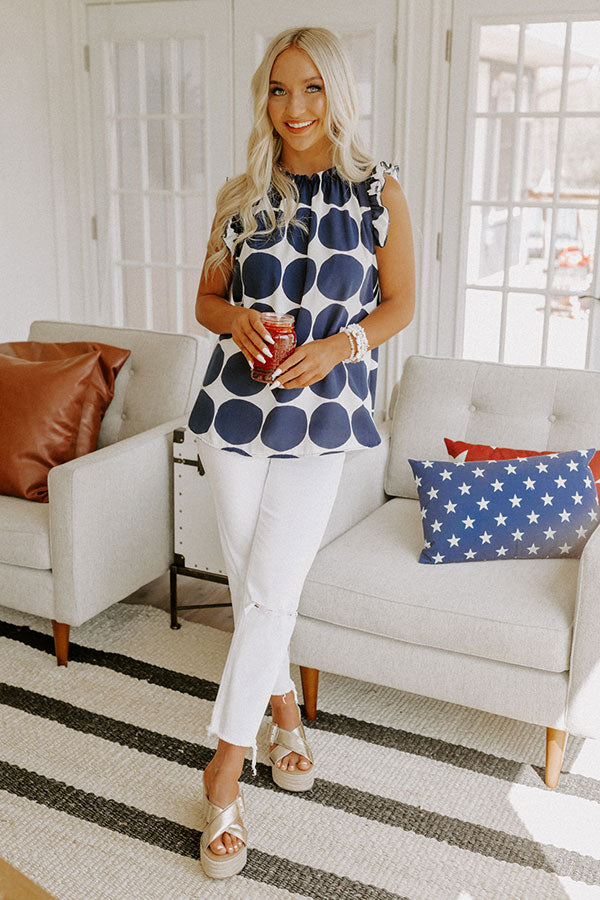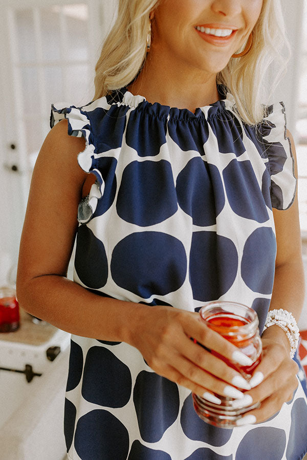 There is no better piece to throw on and go with than this eye-catching shift top featuring lightweight material patterned with large navy polka dots, a rounded neckline, ruffled cap sleeves, and a relaxed silhouette that falls into a straight hemline! on products Measurements