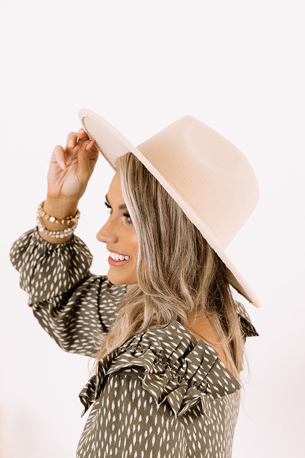 Make an entrance in our eye-catching cream colored 'Brunch Babe' hat featuring soft lightweight felt material and a stiff 3.5-inch brim!