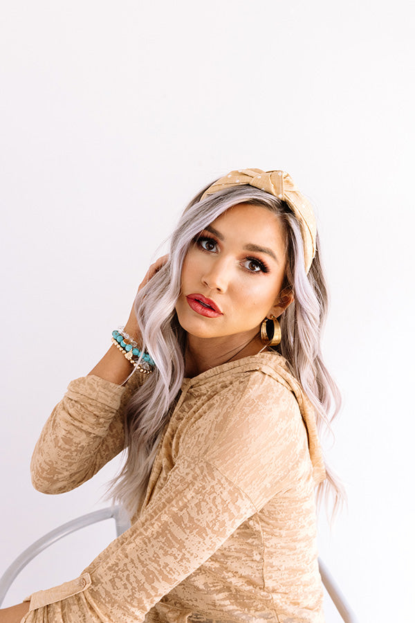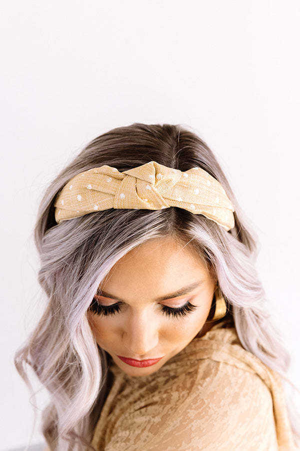 No matter where you are bound to go, this adorable tan headband is perfect for all occasions! It features lightweight raffia material patterned with small white polka dots and an open structured silhouette with an accent top knot!