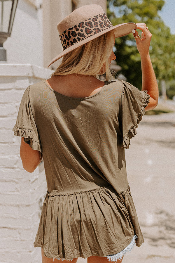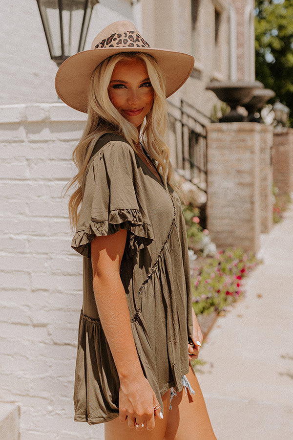 You will look like a total babe when you arrive to brunch in this flirty army green hued top featuring lightweight flowy material, a wide v-cut neckline, short loose sleeves with ruffled trim detailing, and a draped babydoll silhouette that falls into an uneven hemline!