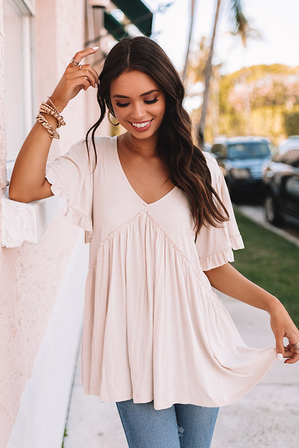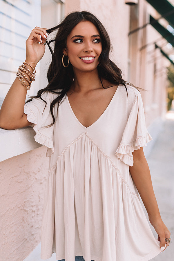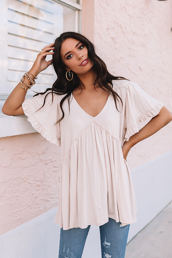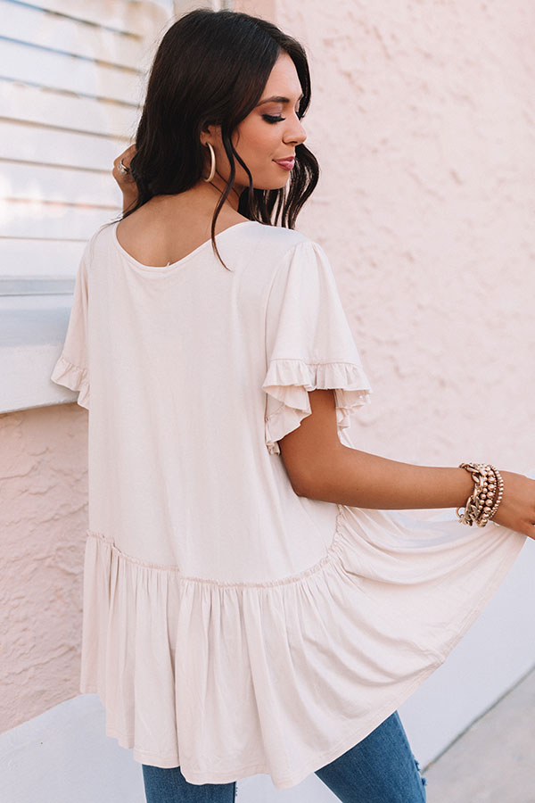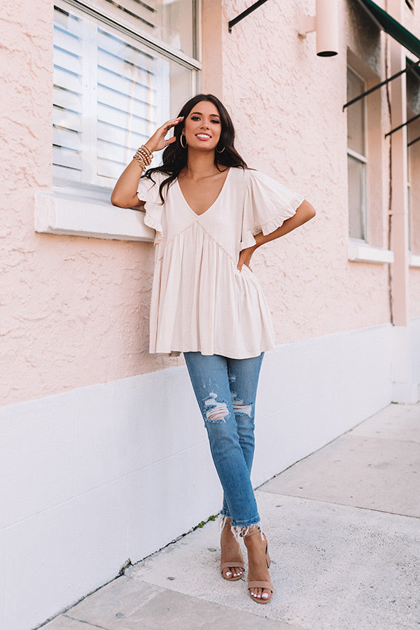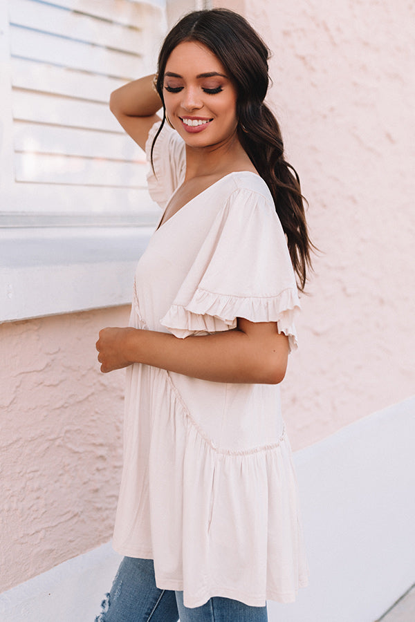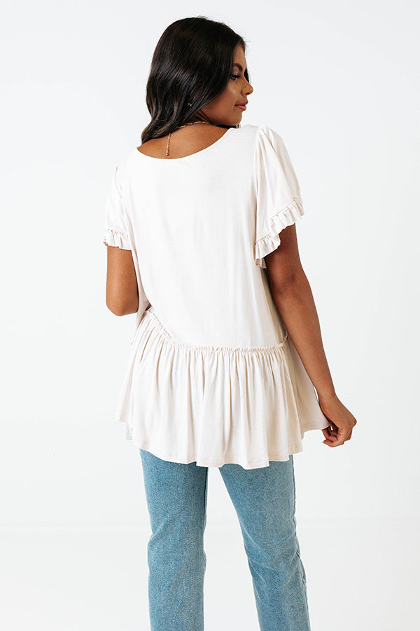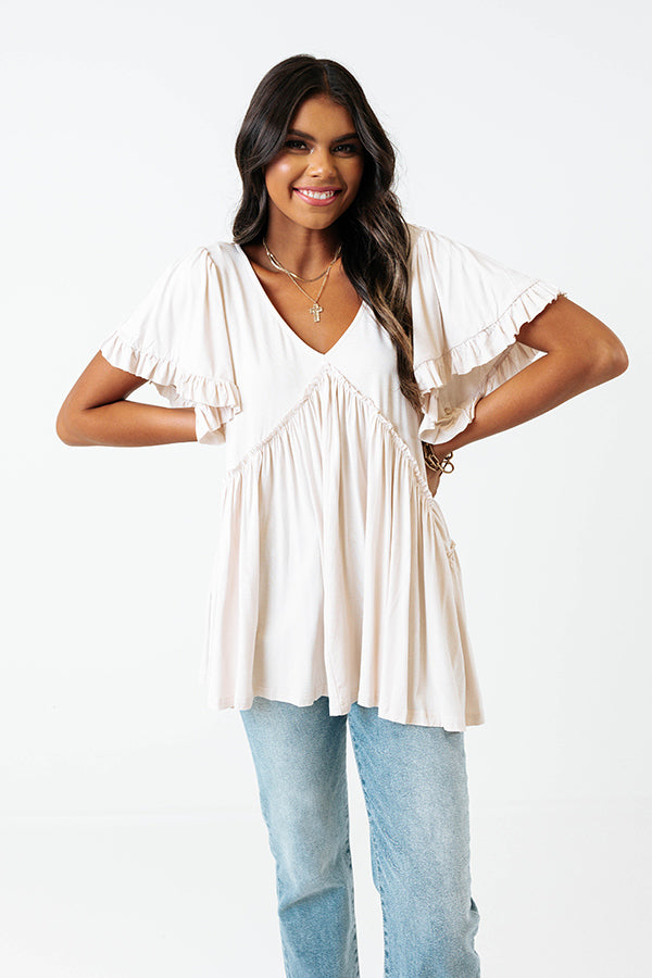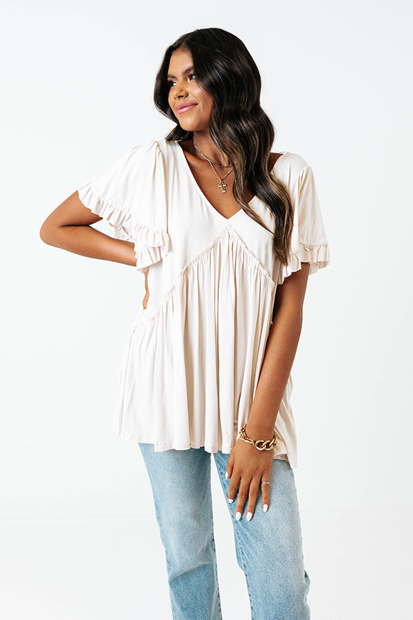 You will look like a total babe when you arrive to brunch in this flirty cream hued top featuring lightweight flowy material, a wide v-cut neckline, short loose sleeves with ruffled trim detailing, and a draped babydoll silhouette that falls into an uneven hemline!