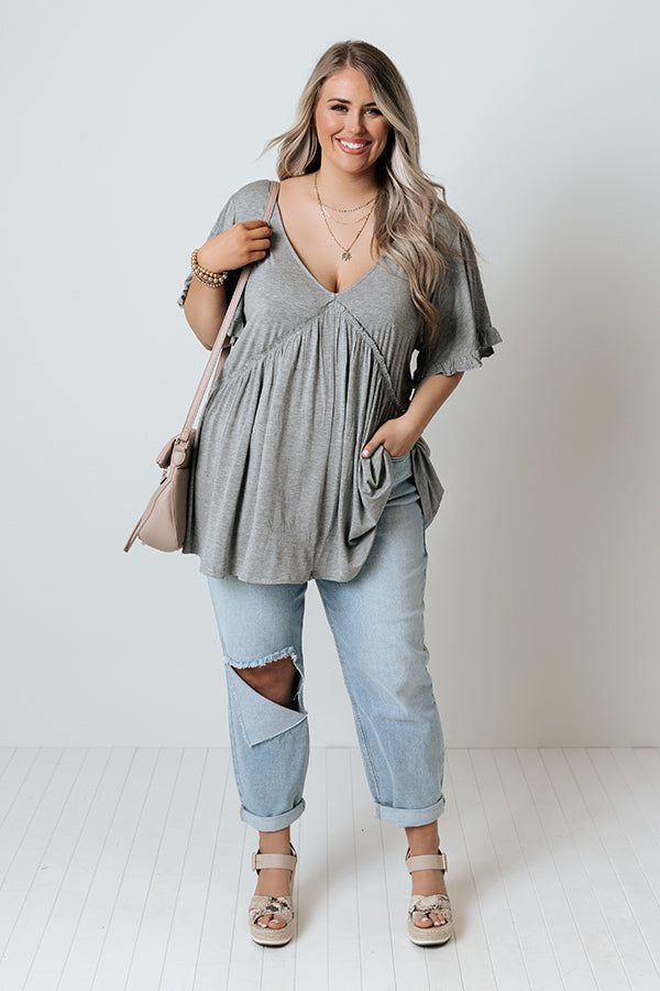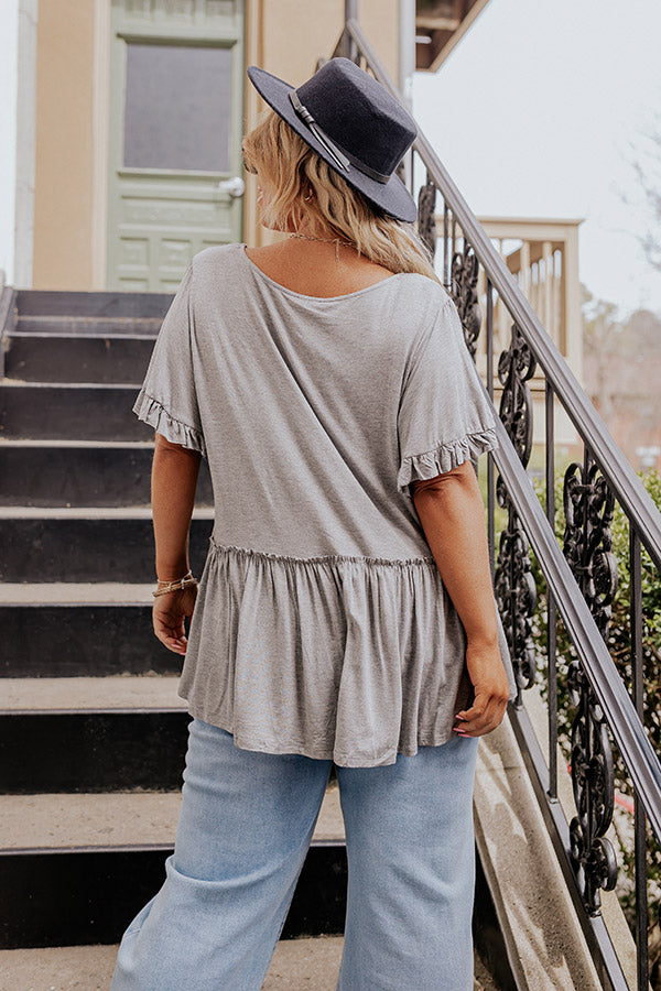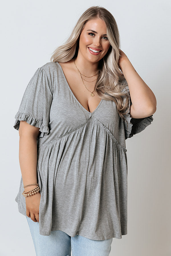 Plus Size - Arrive in style with our darling grey 'Brunchin' Babe' top featuring lightweight flowy material, a v-cut neckline, short loose sleeves with ruffled trim detailing, and a relaxed but flattering babydoll silhouette that falls into an uneven hemline!