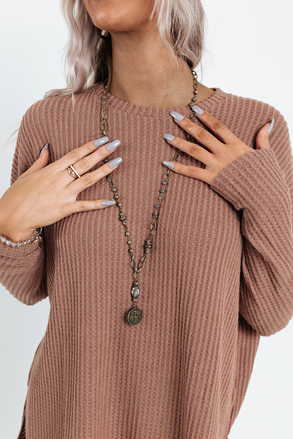 Arrive to brunch in style with this beautiful necklace featuring a long beaded chain with a gemstone and bronze coin accent!