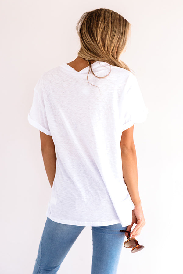 This adorable white tee is for all you brunettes out there! It features soft lightweight material with cute orange lettering on the front, a high rounded neckline, short loose sleeves, and a relaxed silhouette that falls into a straight hemline that can be knotted! We have styled this trendy piece with some distressed light wash flares, sunnies, brown mule heels, and a leopard crossbody, but you can also wear it with a denim skirt, "The Mara Sandal in Persimmon," and our matching "Floral Festivities Hair Scarf in Yellow!"