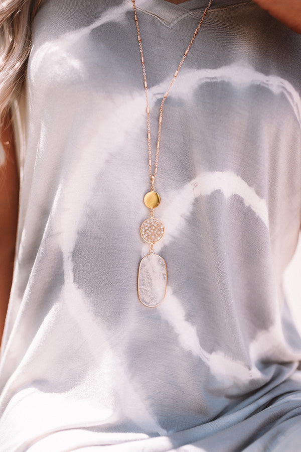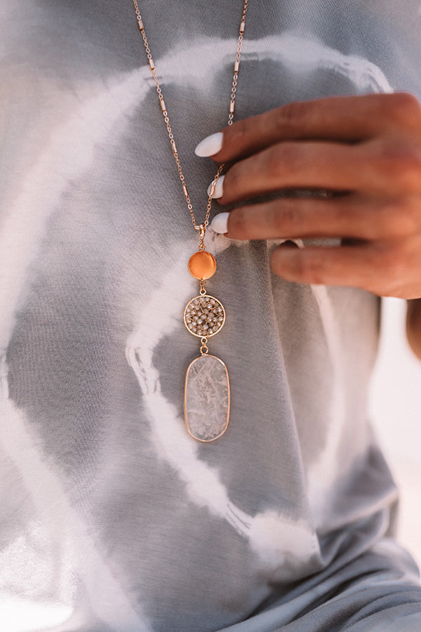 You will for sure be arriving in style when you accessorize your OOTD with our stunning "Bryant Park Brunch" necklace featuring a long dainty gold chain with a gold circle charm, a beaded hoop, and an oblong semi precious clear pendant!