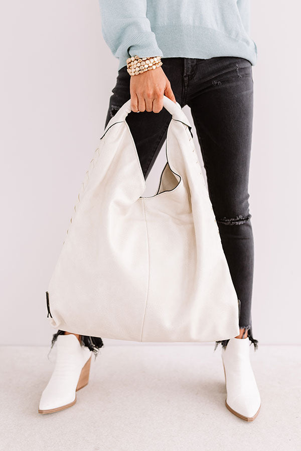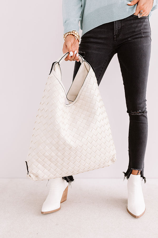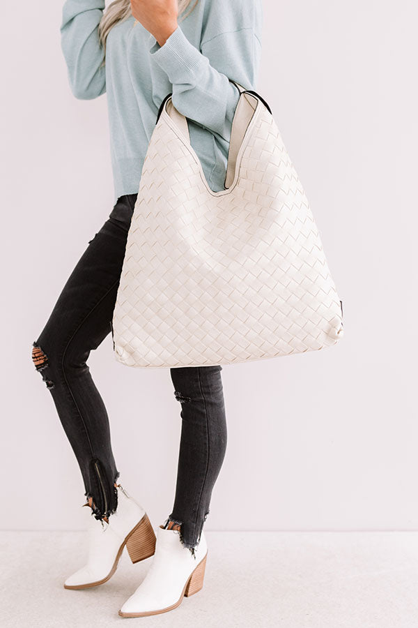There is no better way to make a statement than with a gorgeous handbag! Our stone colored "Bryant Park Bungalow" tote features sleek faux leather material with woven texturing, a single tote handle, and a spacious lightweight triangle silhouette with additional inside pockets!