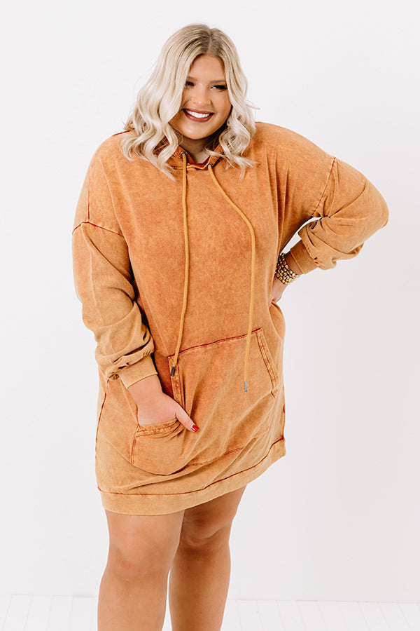 Plus Size - Cuddle up in our adorable light orange hued sweater dress featuring soft lightweight mineral wash material, a high neckline with a drawstring hooded back, long loose sleeves with fitted cuffs, a large kangaroo front pocket, and an ultra slouched silhouette that falls into a straight mid-thigh length hemline!