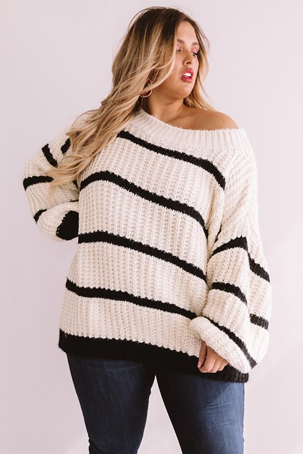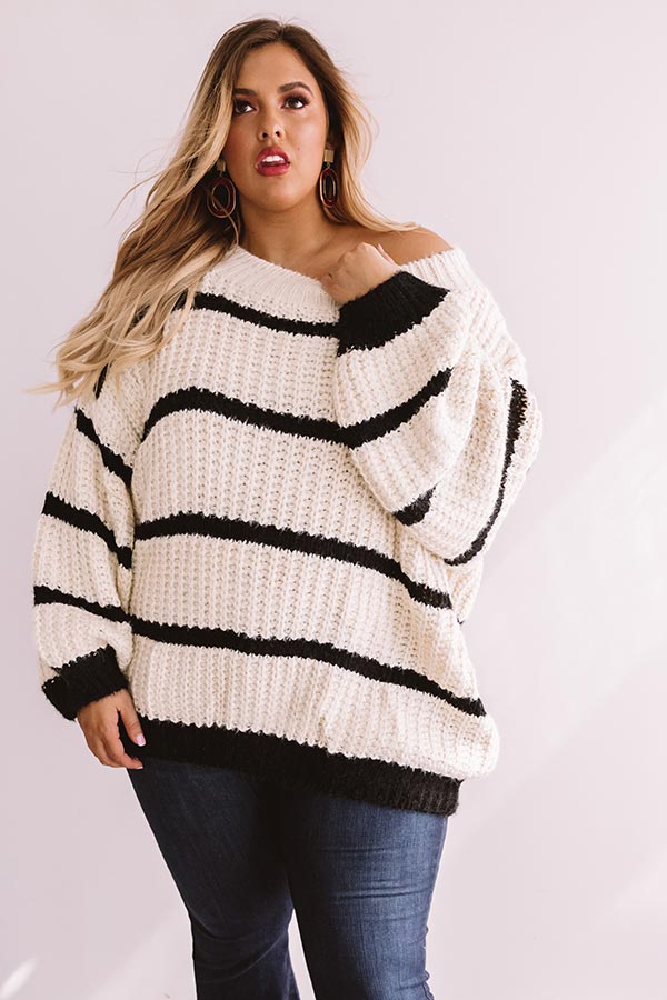 Plus Size - Stay stylish and warm while drinking bubbly by the bonfire with this chunky fall sweater featuring a loose knit texture, black horizontal stripes, a high and wide rounded neckline that can be worn off one shoulder, long oversized bishop sleeves with fitted cuffs, and an ultra relaxed bodice that falls into a rounded hemline! We have styled this adorable piece with some dark denim flares and a matching merlot crossbody and faux suede hat, but you can also wear it with our "Sweet Victory High Waist Corduroy Skirt in Wine," a taupe over the knee boot, and our "Plans In Paris Wool Hat in Taupe!" Measurements