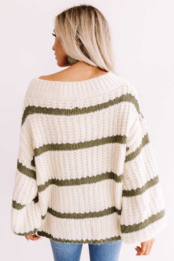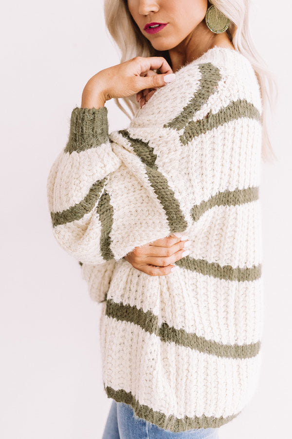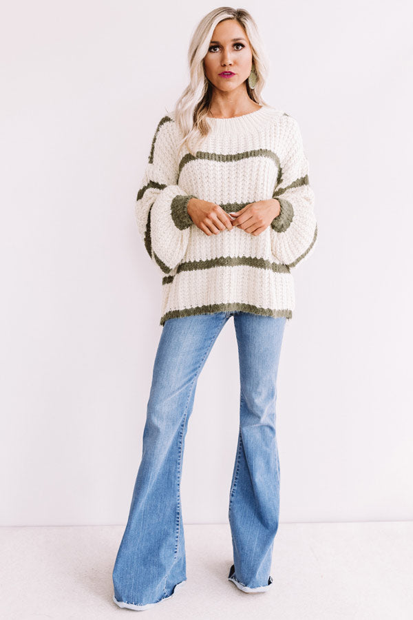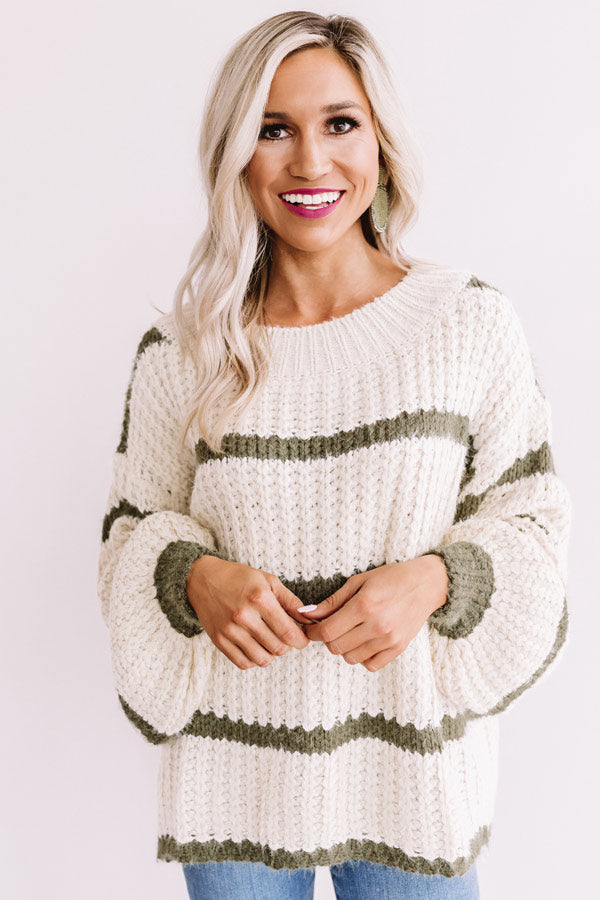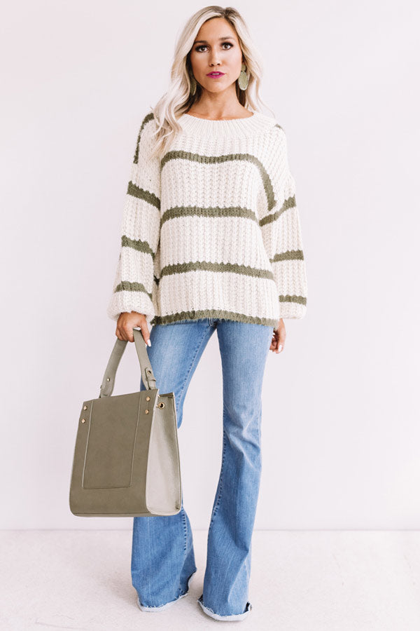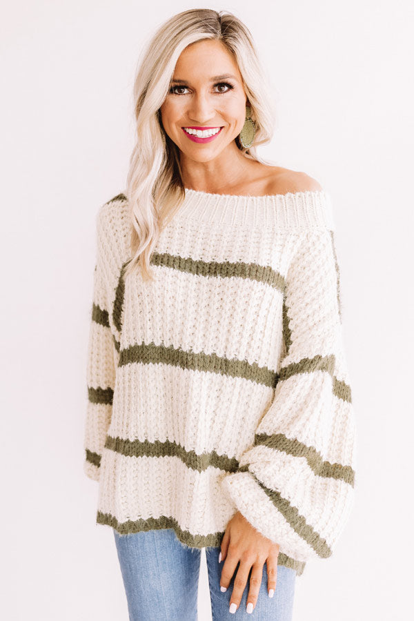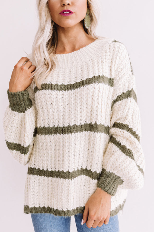 Stay stylish and warm while drinking bubbly by the bonfire with this chunky fall sweater featuring a loose knit texture, olive horizontal stripes, a high and wide rounded neckline that can be worn off one shoulder, long oversized bishop sleeves with fitted cuffs, and an ultra relaxed bodice that falls into a rounded hemline! We have styled this adorable piece with some light wash denim flares and a matching tote and statement earring, but you can also wear it with our "Weekend In NYC Ribbed Velour Skirt in Black," a taupe over the knee boot, and our "Plans In Paris Wool Hat in Taupe!" Measurements