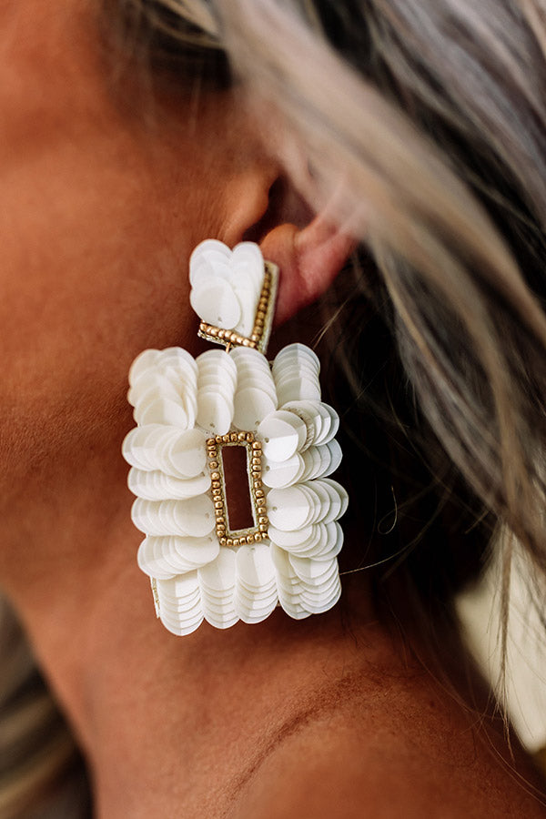 You are sure to be one bubbly beauty when you accessorize with these stunning statement earrings featuring tiny gold beaded and ivory sequin studs and oversized dangling rectangular hoops!