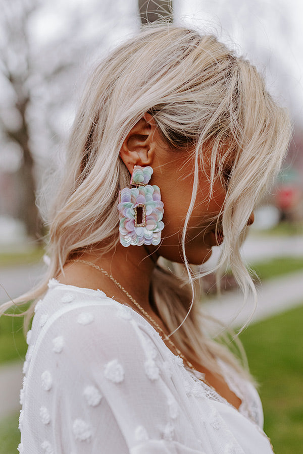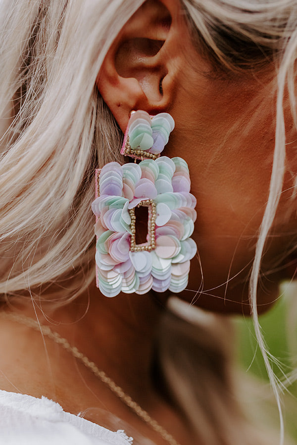 You are sure to be one bubbly beauty when you accessorize with these stunning statement earrings featuring tiny gold beaded and multi colored sequin studs and oversized dangling rectangular hoops!