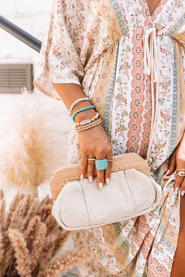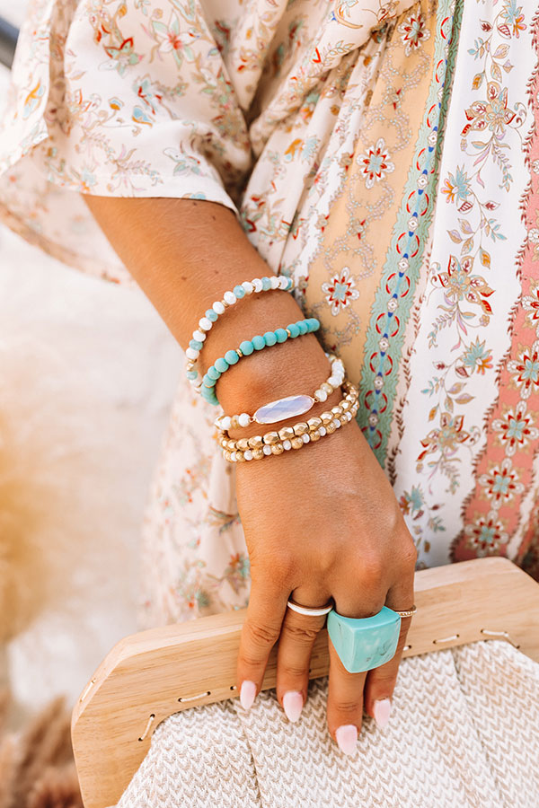 Upgrade your arm candy with our darling 'Bubbly Bliss Bracelet Set' featuring five aqua and gold beaded stretch pieces!