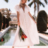 Let your bubbly personality shine in this stunning cream hued maxi dress featuring lightweight breezy material, a deep v-cut neckline and upper back with a tie closure, a cinched waistline with a tie closure, oversized short ruffle sleeves, and a button down skirt silhouette that cascades into a straight ankle-length hemline! Measurements