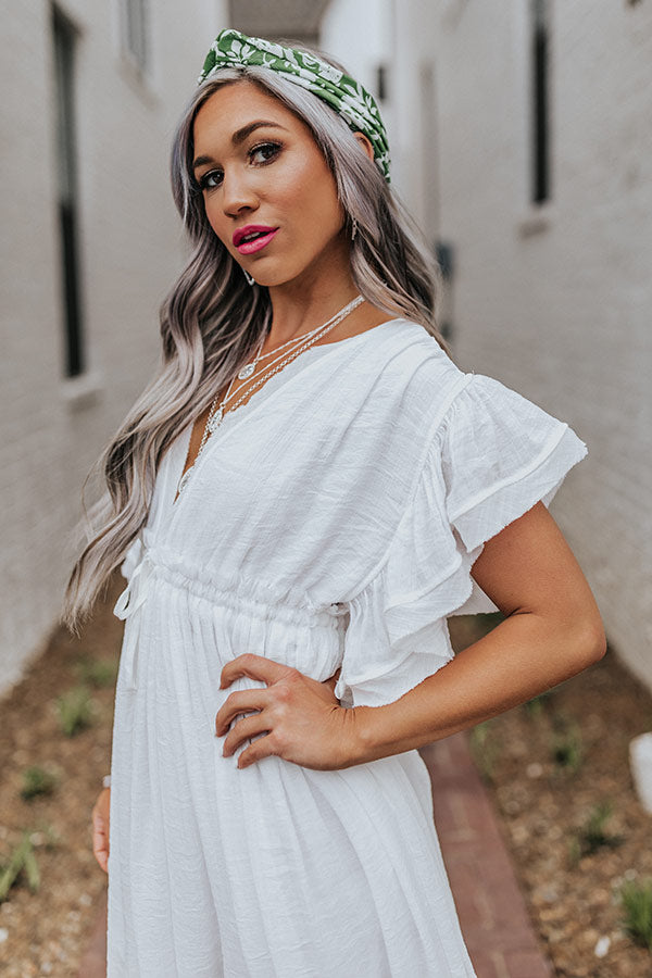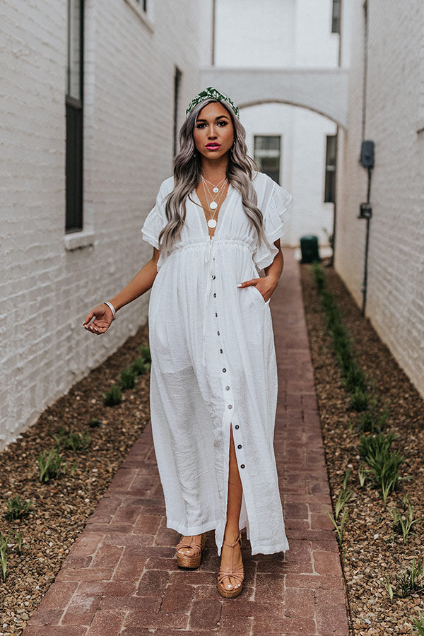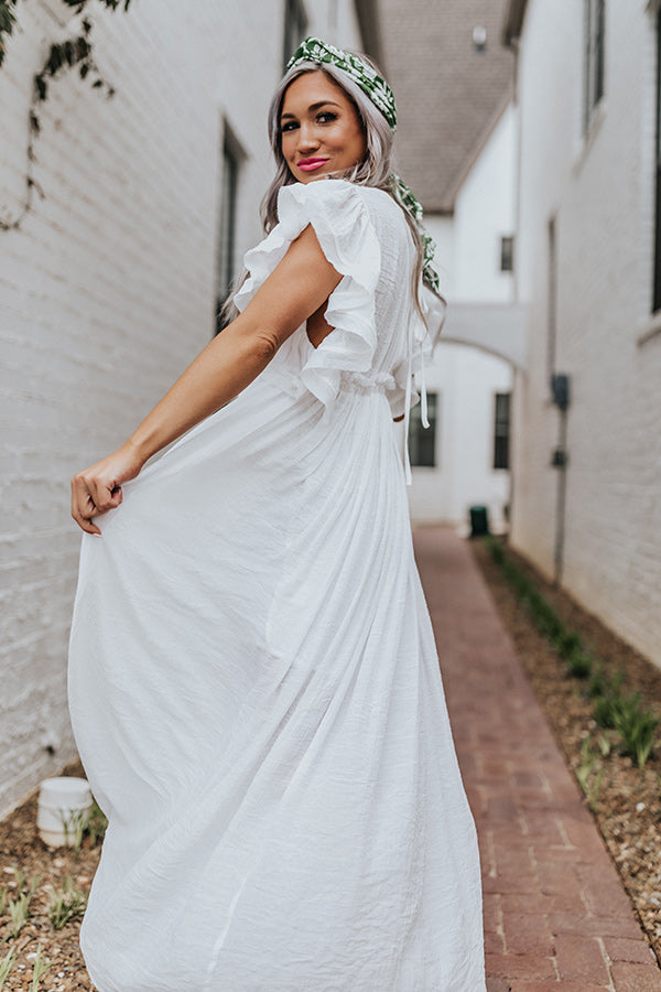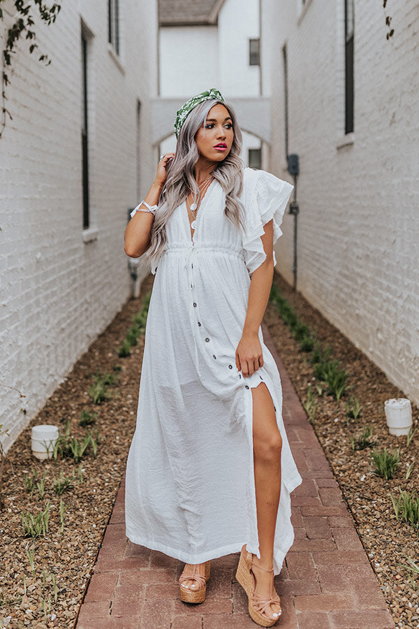 Let your bubbly personality shine in this stunning white maxi dress featuring lightweight breezy material, a deep v-cut neckline and upper back with a tie closure, a cinched waistline with a tie closure, oversized short ruffle sleeves, and a button down skirt silhouette that cascades into a straight ankle-length hemline! Measurements
