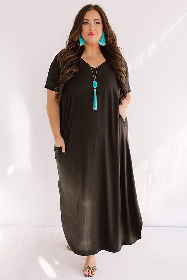 Plus Size - There is no better piece to pack for a "Buena Vista vacay" than this casual black maxi featuring soft lightweight t-shirt material, a wide v-cut neckline that can be worn off one shoulder, short loose sleeves, accent side pockets, and an ultra relaxed silhouette that falls into a rounded floor length hemline with knee-high side slits! We have styled this adorable piece with some leopard heels and turquoise statement jewelry, but you can also wear it layered under a distressed denim jacket with some sunnies, our "Game Day Gorgeous Transparent Leopard Crossbody," and "The Kelsie Espadrille Wedge in Leopard!" Measurements
