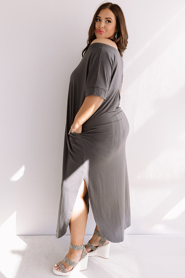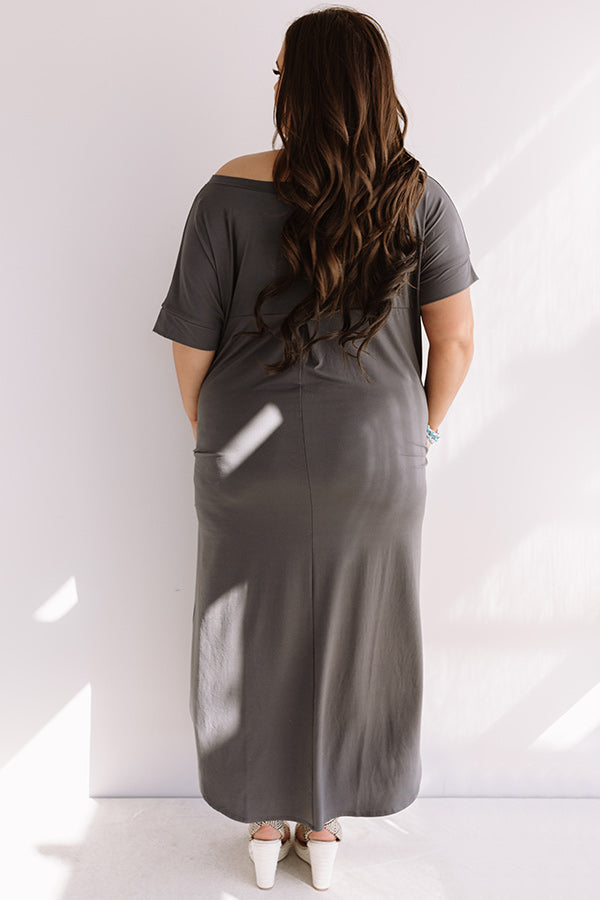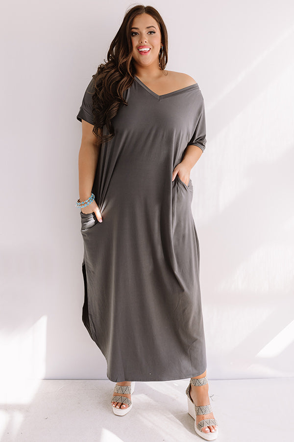 Plus Size - There is no better piece to pack for a "Buena Vista vacay" than this casual charcoal colored maxi featuring soft lightweight t-shirt material, a wide v-cut neckline that can be worn off one shoulder, short loose sleeves, accent side pockets, and an ultra relaxed silhouette that falls into a rounded floor length hemline with knee-high side slits! We have styled this adorable piece with some patterned wedges and a neutral crossbody, but you can also wear it layered under a distressed denim jacket with "The Calum Bootie in Blush" and our "All Caught Up Headband in Blush!" Measurements