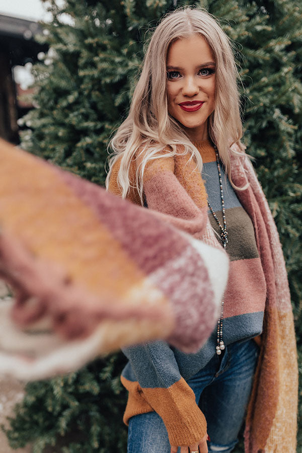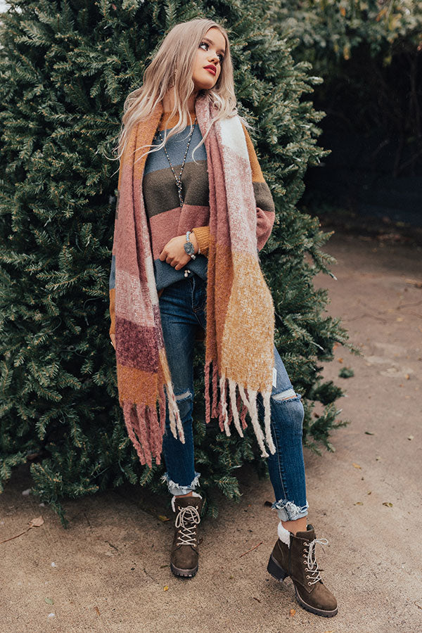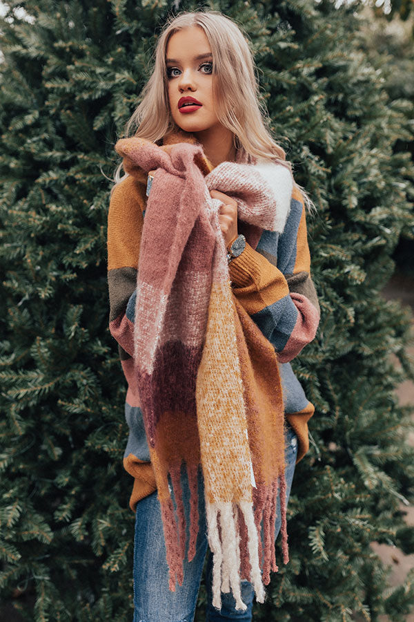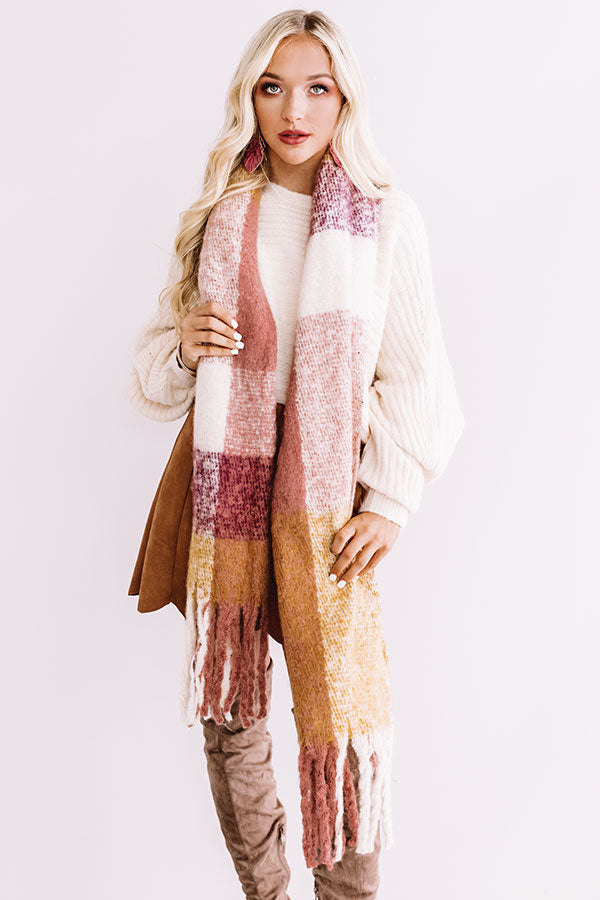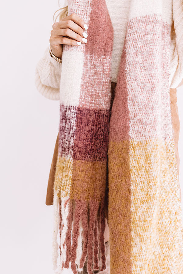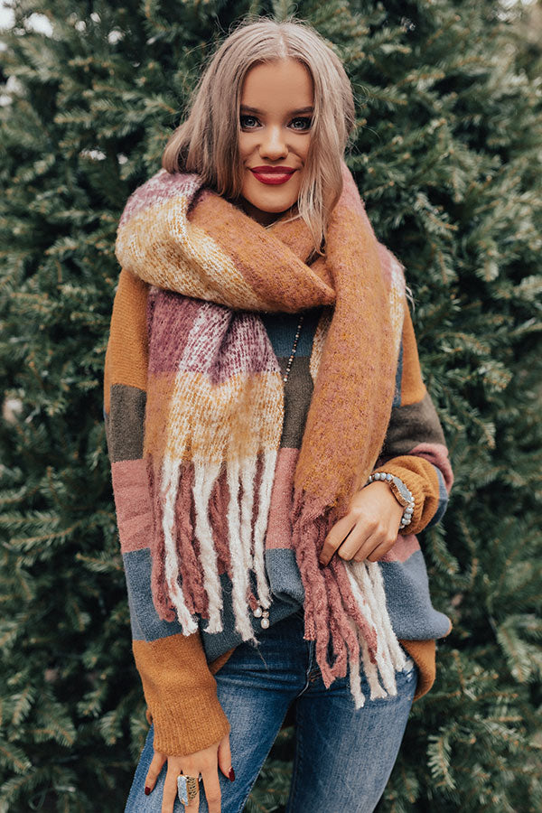 You will be a "bundled up beauty" when you keep warm with this blush hued scarf featuring a fuzzy loose knit material with a large plaid pattern and long fringe detailing!