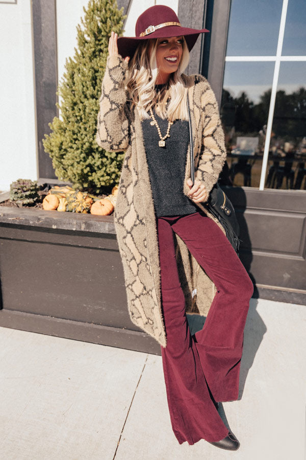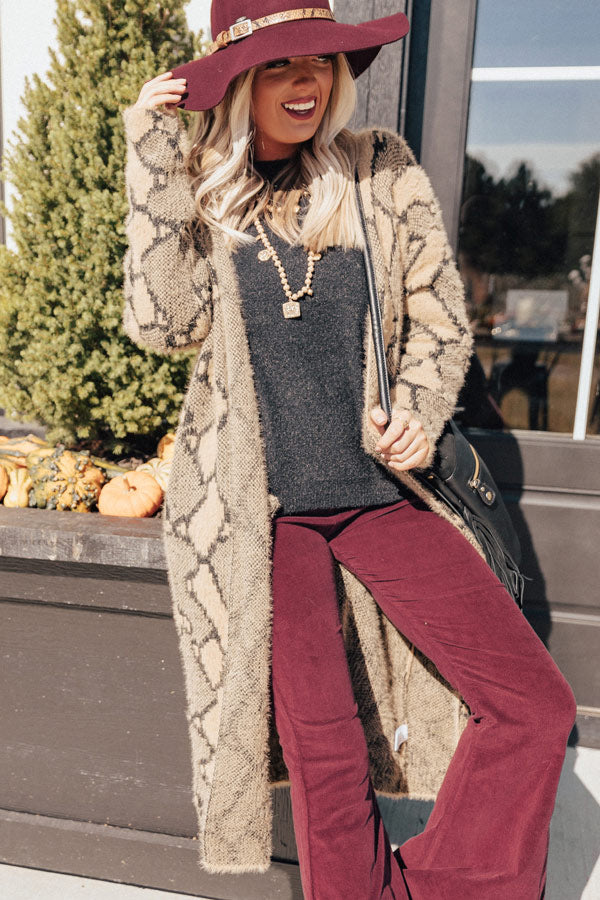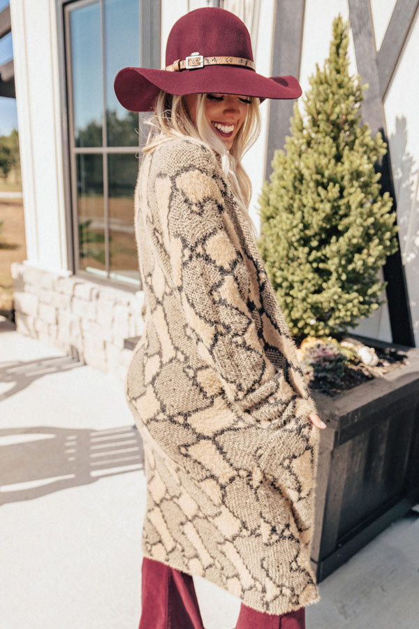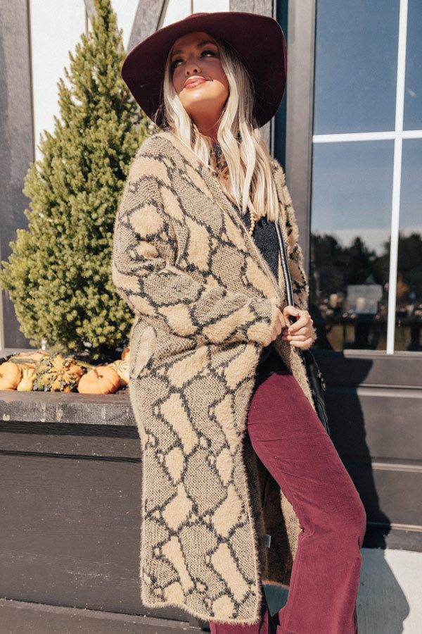 Bundle up for brunch in this adorable neutral hued cardigan featuring soft lightweight tight knit material with fuzzy texturing, a bold black snake print pattern, long loose sleeves with fitted cuffs, low accent side pockets, and a relaxed open front silhouette that falls into a straight calf-length hemline! You can style this versatile piece with just about anything from a basic tank to a sweater, jeans to skirts or dresses, booties to wedges or sandals, clutches to totes, and hats to earrings! Measurements