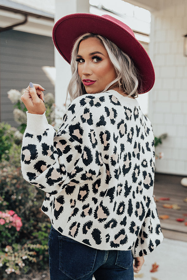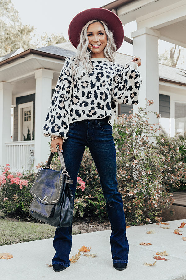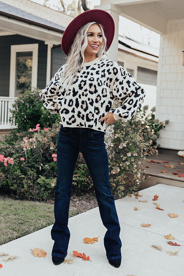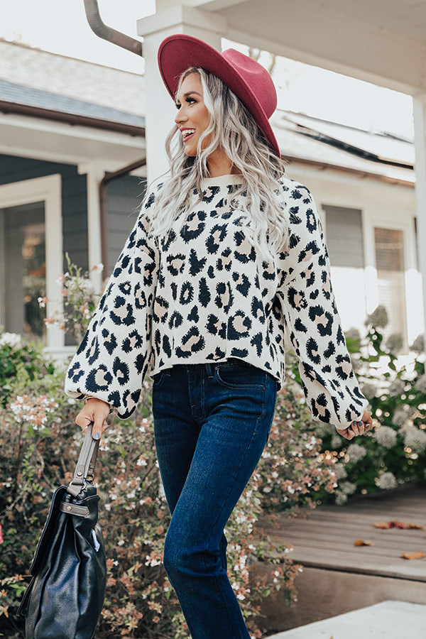 Bundle up in style with this stunning cream colored sweater featuring soft lightweight tight knit material patterned with a large black and neutral hued leopard print, a high rounded neckline, long oversized sleeves with fitted cuffs, subtle ribbed trim detailing, and a flattering silhouette that falls into a straight hemline! Measurements