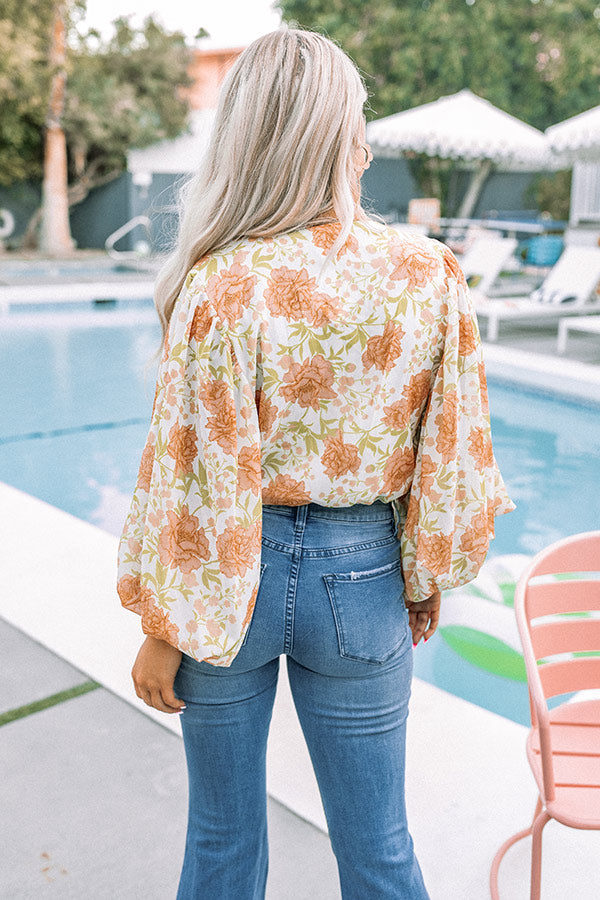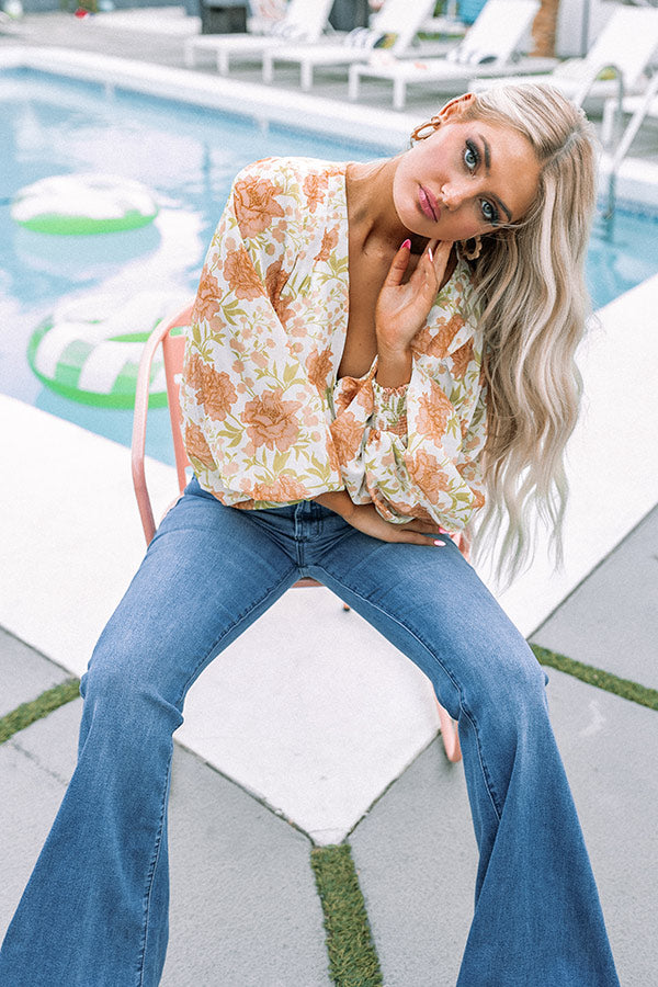 Flirt your way through summer in our stunning 'Bungalow Glow' bodysuit featuring lightweight material patterned with a large orange and green floral print, a faux wrap bodice with a v-cut neckline, long oversized bubble sleeves, and a relaxed silhouette that ends in cheeky fit bottoms with a snap closure!