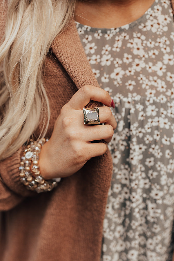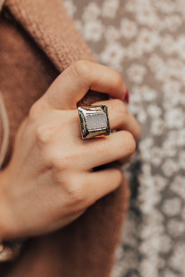 Make a subtle statement with our gorgeous 'Buried Treasure' ring featuring a square grey druzy stone set inside a gold square setting! Due to this being a natural stone there may be some variations in color, shape, and size.