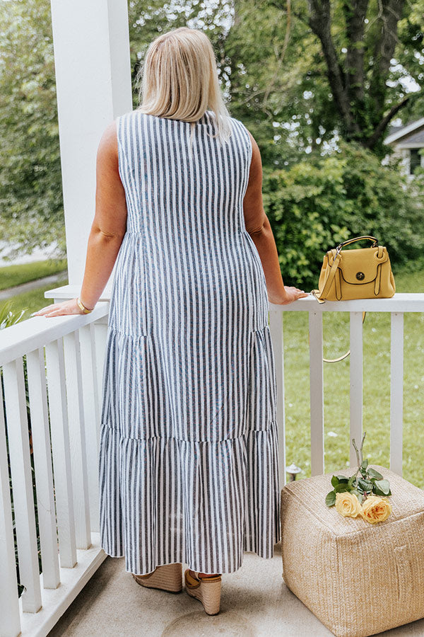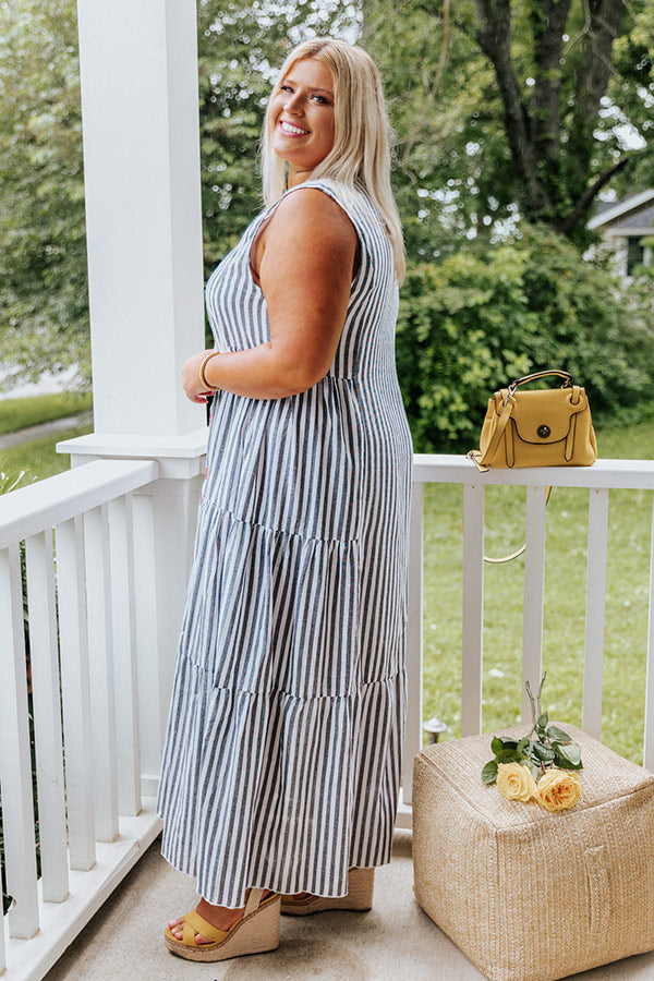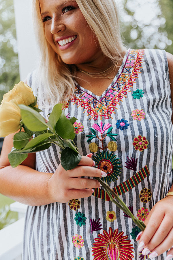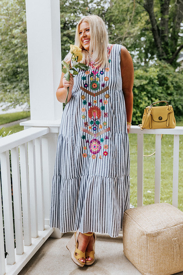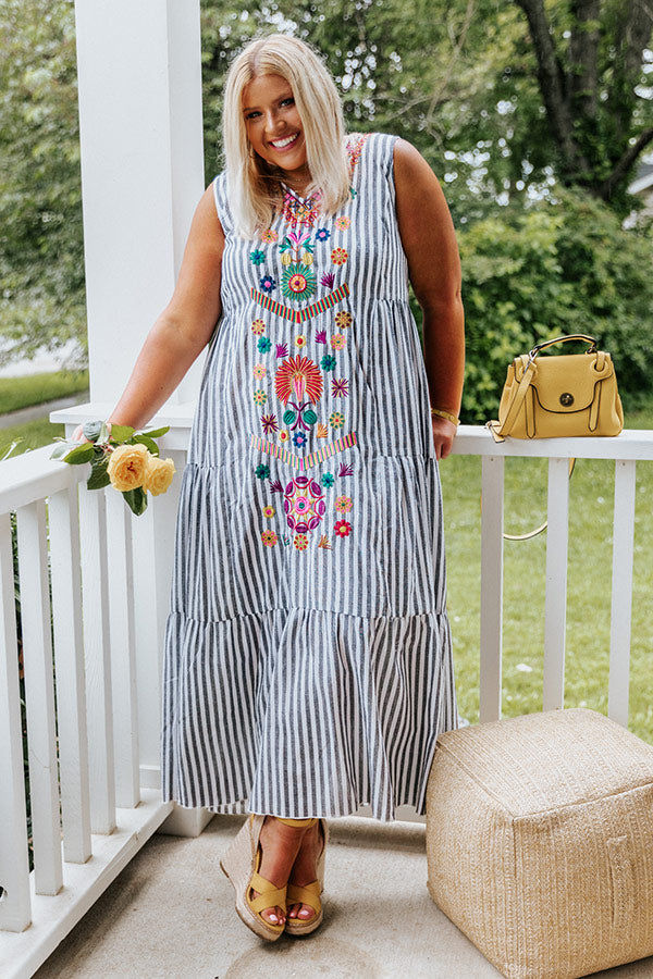 Plus Size - You will look like a beautiful babe in this unique maxi dress featuring lightweight flowy material patterned with horizontal pin stripes and intricate colorful embroidered detailing, a v-cut neckline with wide shoulder straps, and an ultra relaxed tiered silhouette that cascades into a straight ankle-length hemline! Measurements