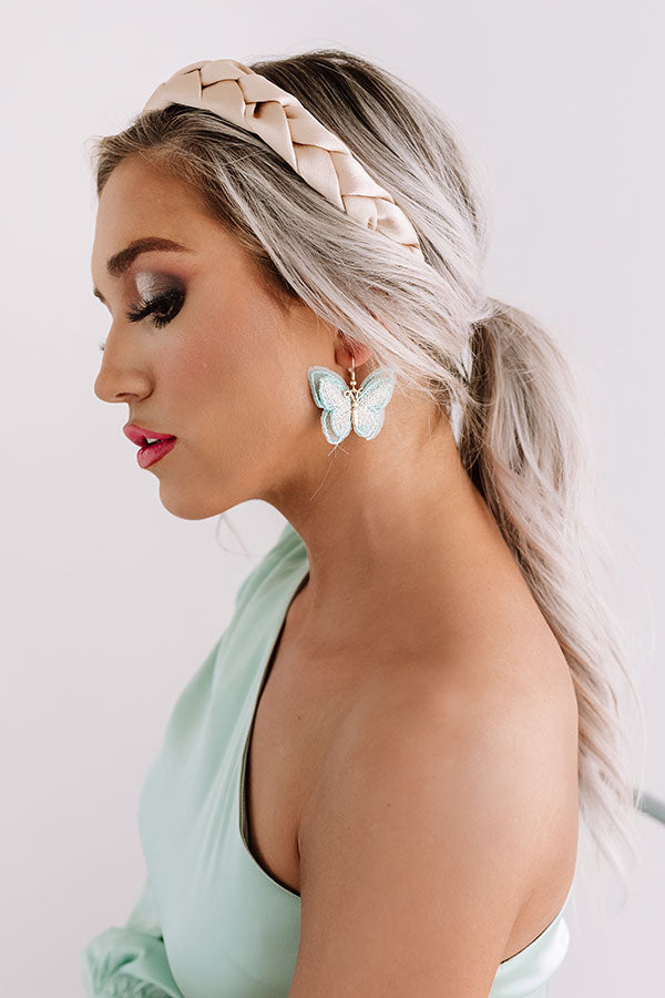 Spread your wings and accessorize with our adorable "Butterfly Kisses" statement earrings featuring dangling ocean wave colored woven butterflies!