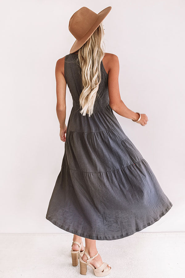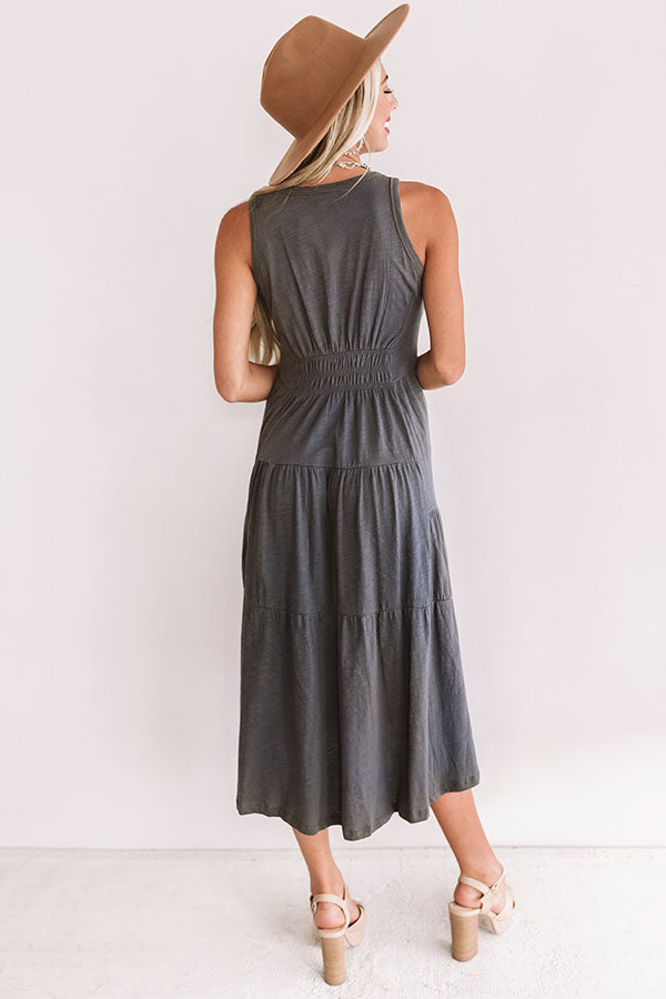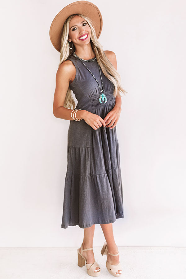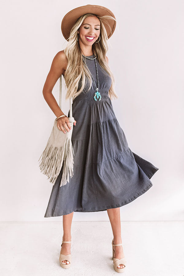 You will look like you belong by the beachside in this charcoal midi with its cinched elastic waistband, abstract skirt seams, and wide straps! Style this piece with neutral platform heels, a long necklace, faux suede hat, and a fringed shoulder bag for a stylish summer outfit that has a touch of boho personality! Measurements