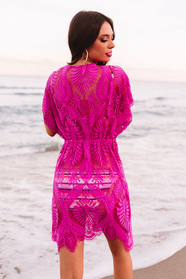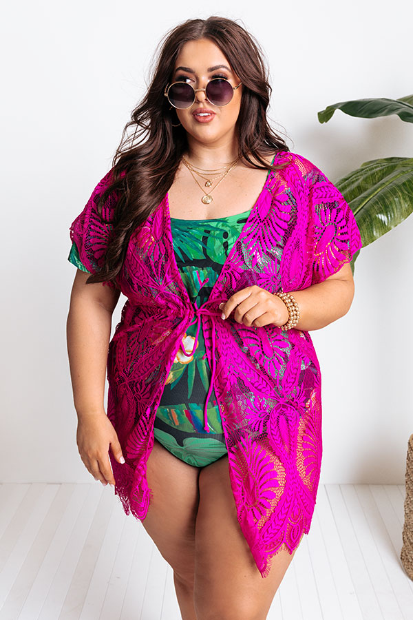 Plus Size - You will feel nothing but bliss when you wear this adorable fuchsia hued overlay featuring ultra lightweight semi sheer material patterned with an intricate lace floral print, short loose sleeves, a tie string belt, and a relaxed open front silhouette that falls into a scalloped mid-thigh length hemline! Measurements