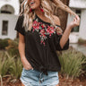This floral embroidered waffle knit top has the perfect lightweight feel. With raw cut short sleeves, a wide scoop neck that can perfectly be taken off the shoulder, front tying detail & a cute raw cut hemline this top is perfect under your favorite jacket & also stands alone boldly!