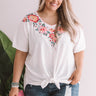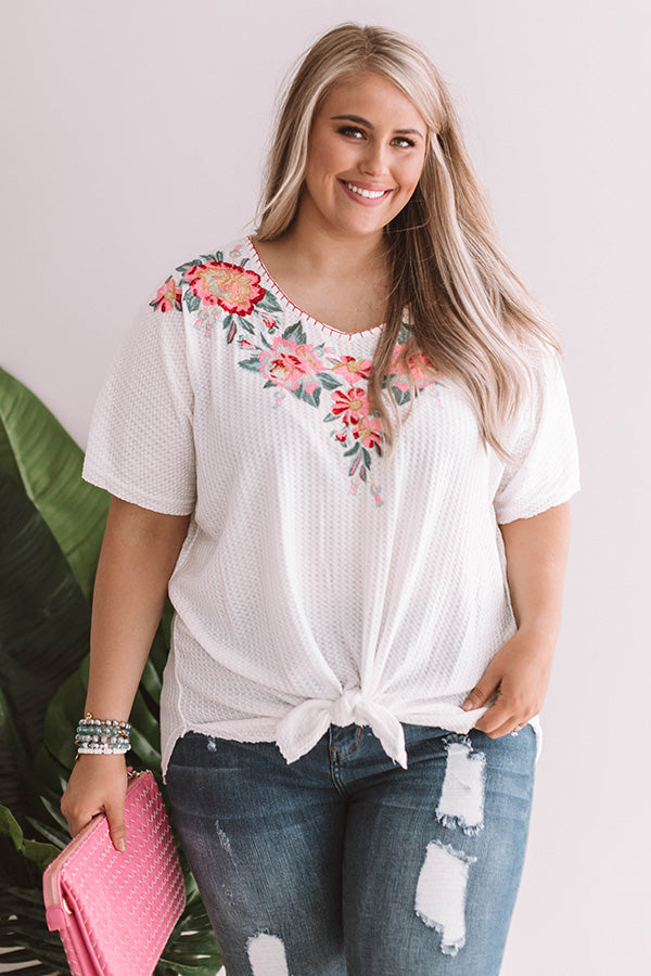 Plus Size - This floral embroidered waffle knit top has the perfect lightweight feel. With raw cut short sleeves, a wide scoop neck that can perfectly be taken off the shoulder, front tying detail & a cute raw cut hemline this top is perfect under your favorite jacket & also stands alone boldly!