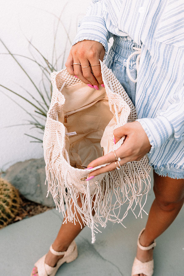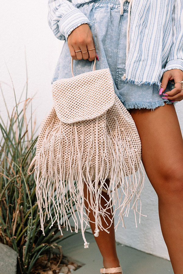Keep your summer bag casual with our effortless light beige colored 'Cabana Spot' backpack featuring lightweight raffia material with fringe detailing, a rounded flap with a snap button, a single top handle, two adjustable shoulder straps, and a spacious fully lined interior with a cinched closure!