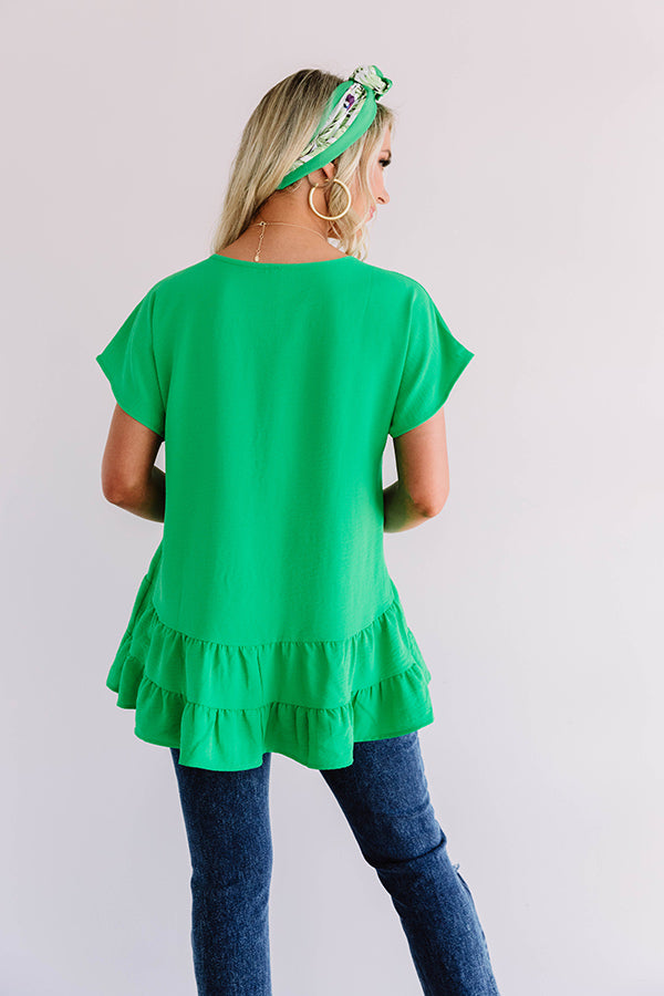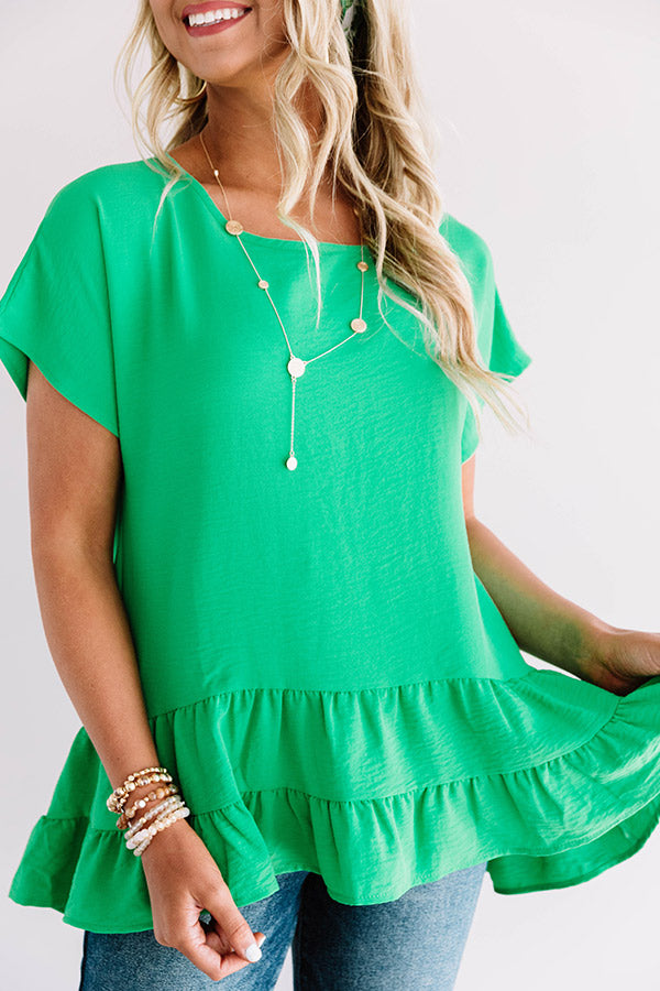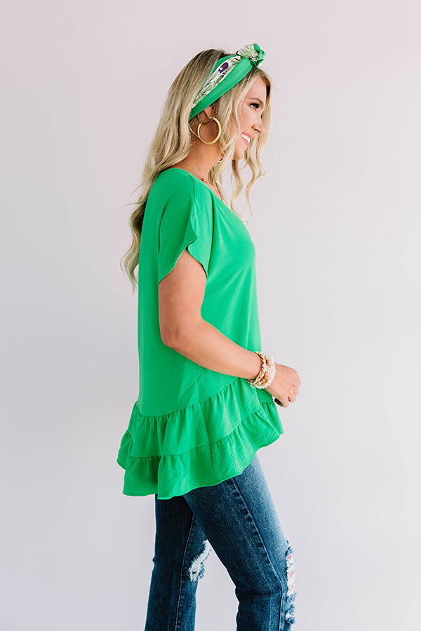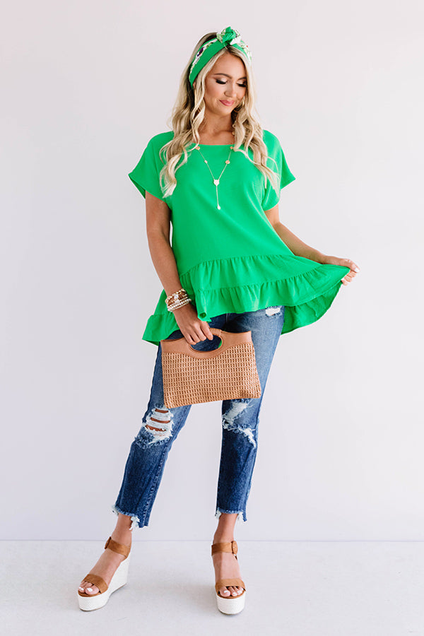 Add a pop of color to your summer wardrobe with our adorable kelly green "Cabana Toast Shift Top" featuring lightweight breezy material, a high rounded neckline, short loose sleeves, and a relaxed silhouette that falls into an uneven oversized ruffle hemline! We have styled this darling piece with some distressed denim, a matching headband, and a brown wedge and clutch, but you can also wear it with some distressed white shorts, "The Nixie Lace Up Heel in Green," and our "Sippin' At Sunset Sunnies in White!" Measurements