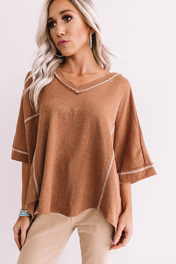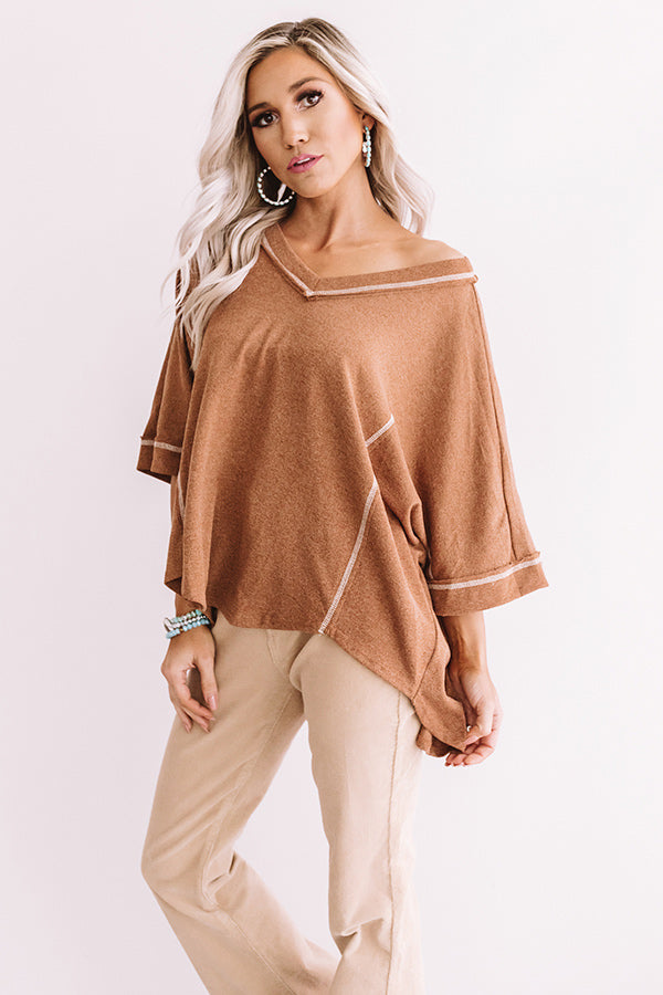There is no better piece to wear while enjoying "Cabernet at the cabin" than this cinnamon colored shift top featuring lightweight tight knit material, exposed accent seams, a wide v-cut neckline that can be worn off one shoulder, slouched half sleeves, and an ultra draped silhouette that falls into an uneven hemline! This casual but chic piece styles perfectly with some khaki flares and a snake print bootie and tote, or with some distressed ankle skinnies, "The Seraphina Faux Leather Wedge in Brown," and our "Upstate Adventures Hat in Birch!" Measurements