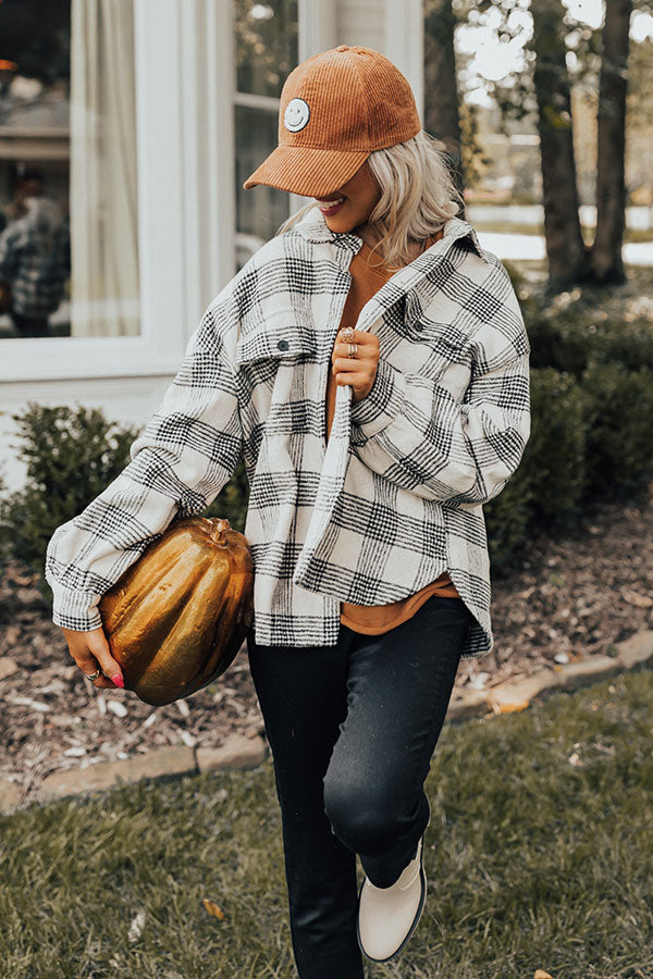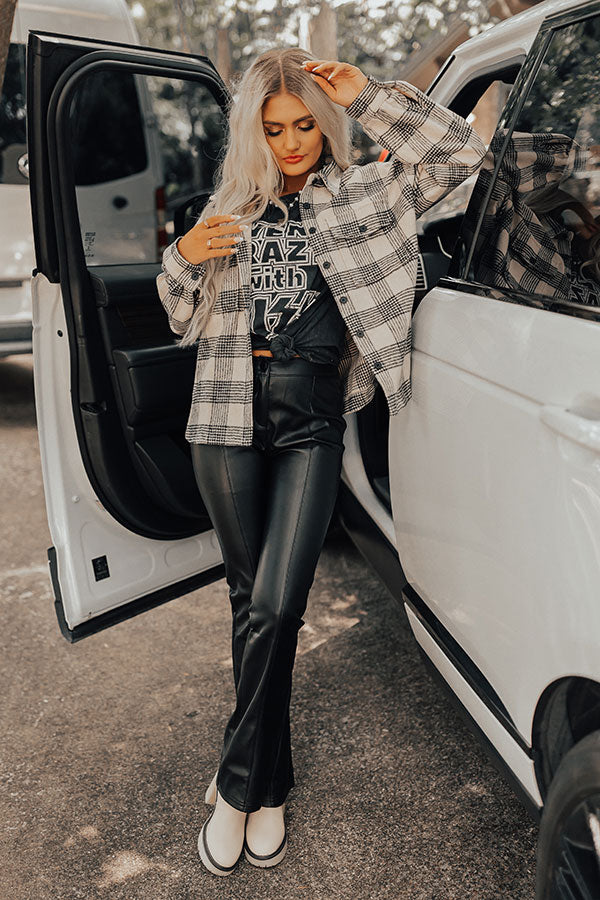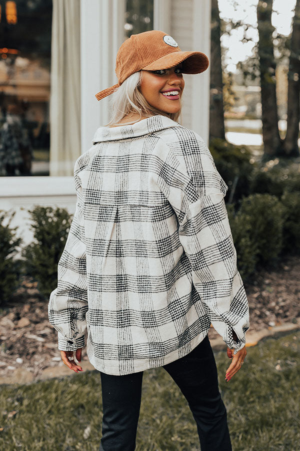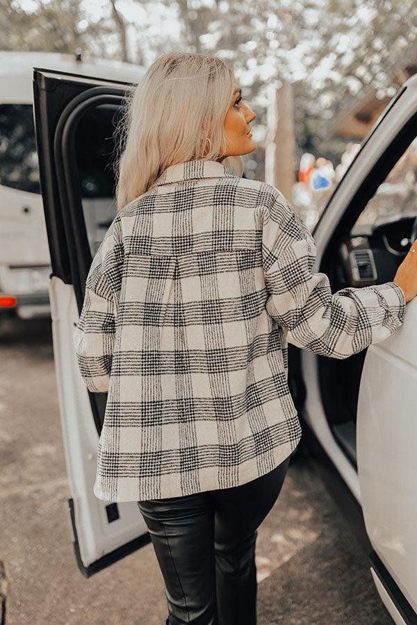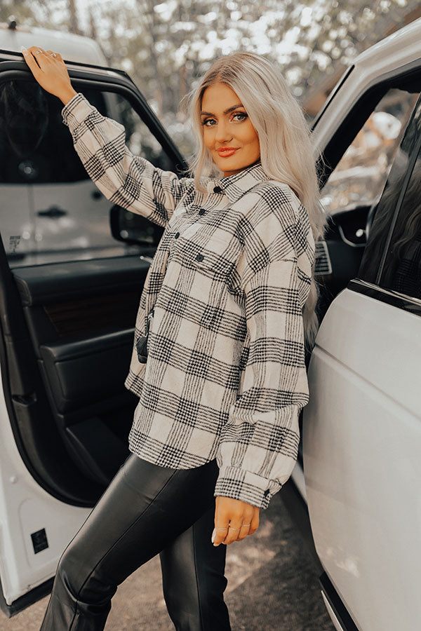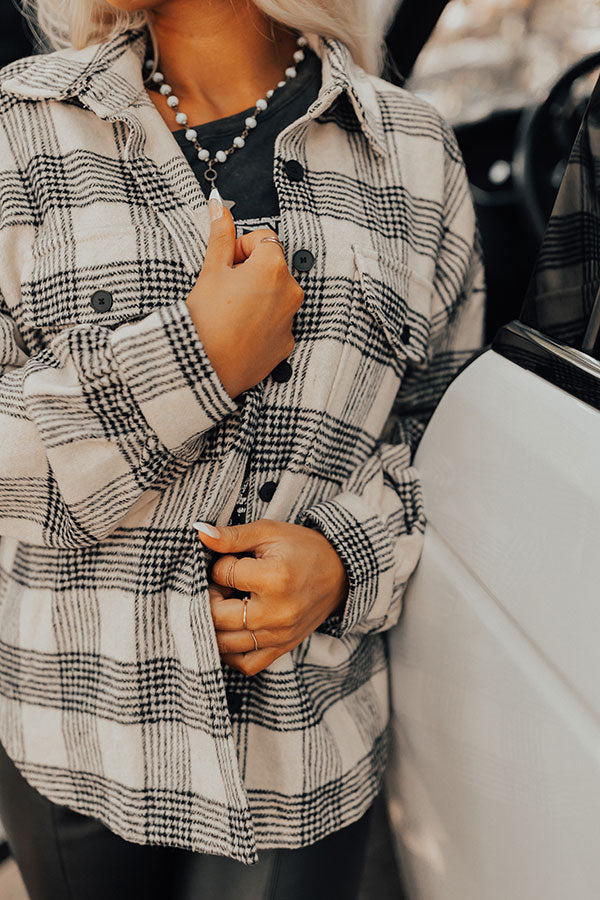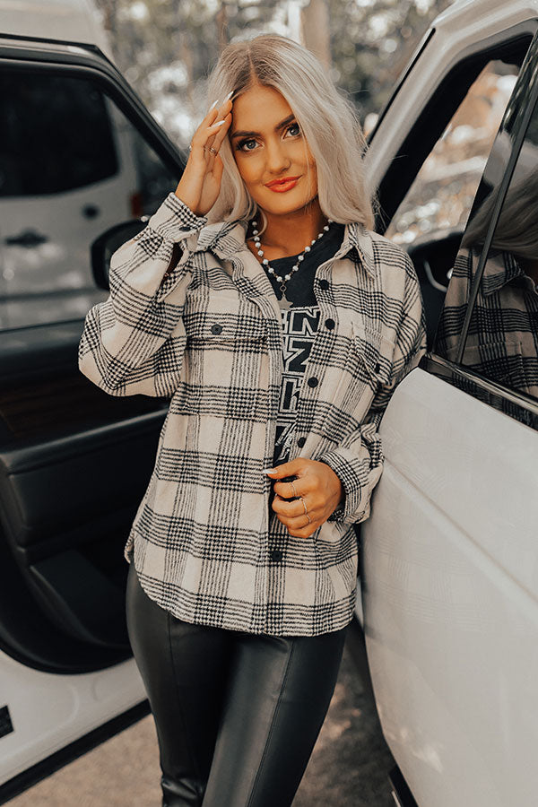 Our trendiest outerwear piece yet, our 'Cabin Cuddles' jacket features lightweight material patterned with a black plaid print, a button down front with a collared neckline, long loose sleeves with button closure cuffs, two chest pockets with flap closures, and a relaxed silhouette that ends in a straight hemline!