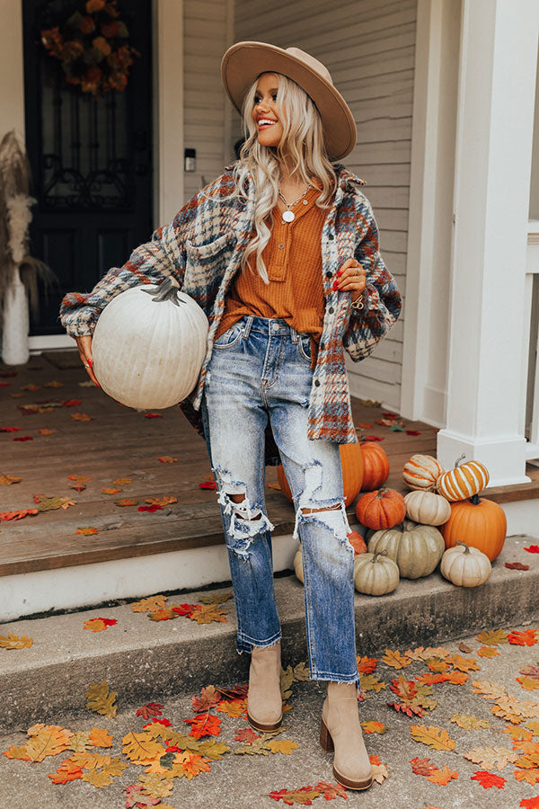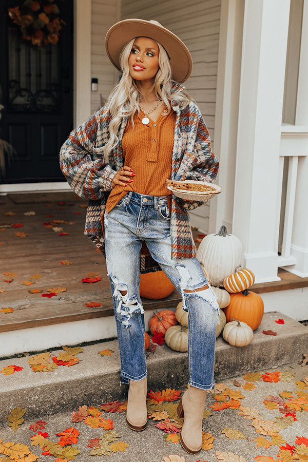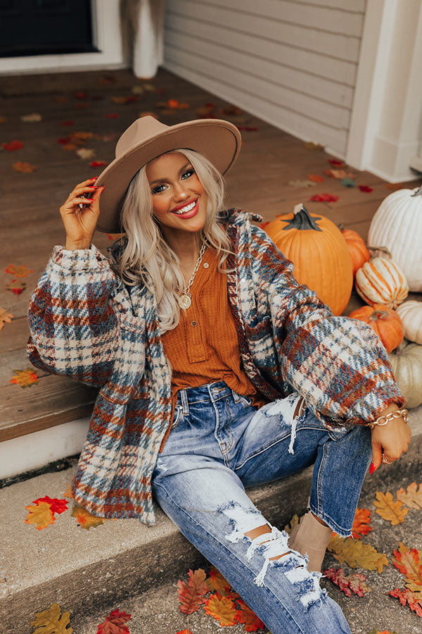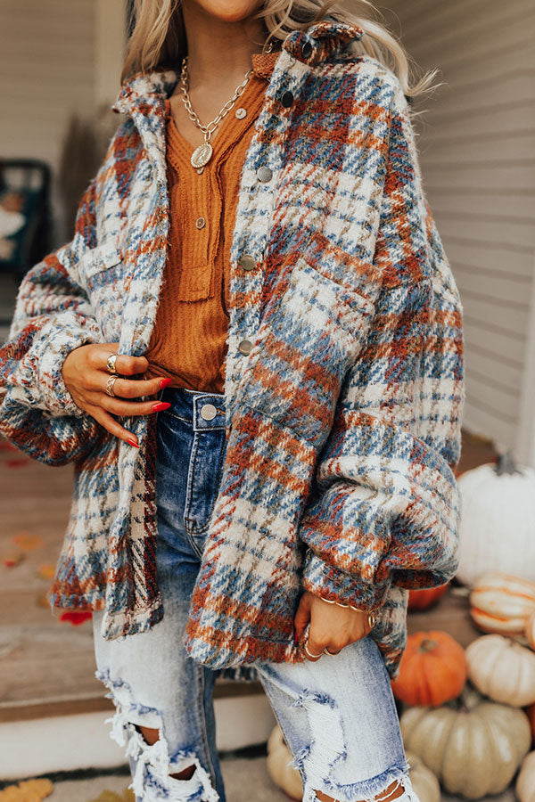 This warm and cozy button up knit jacket features a blue and rust hued plaid design, has two functional chest pockets, and long loose sleeves with button closure cuffs.