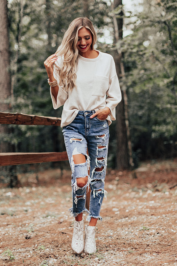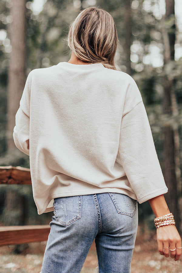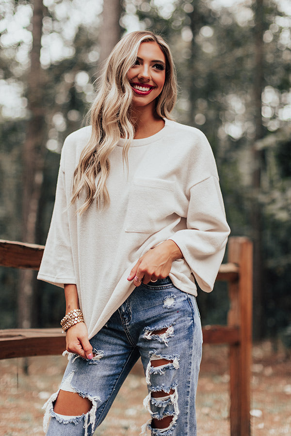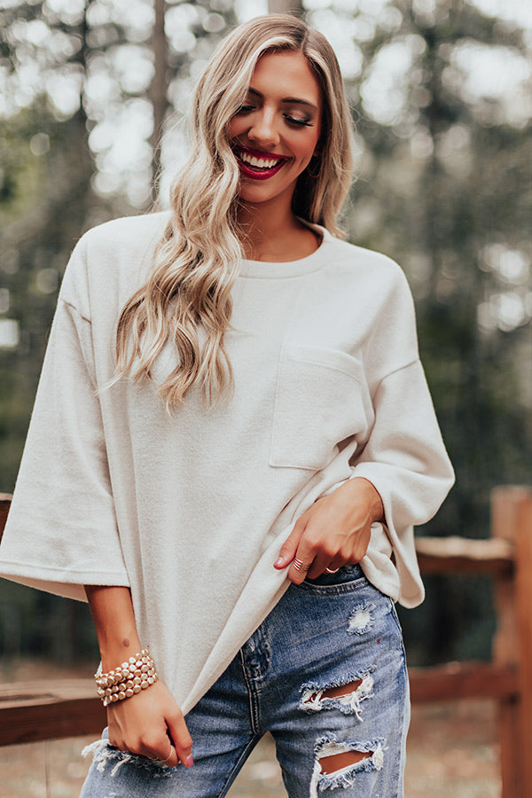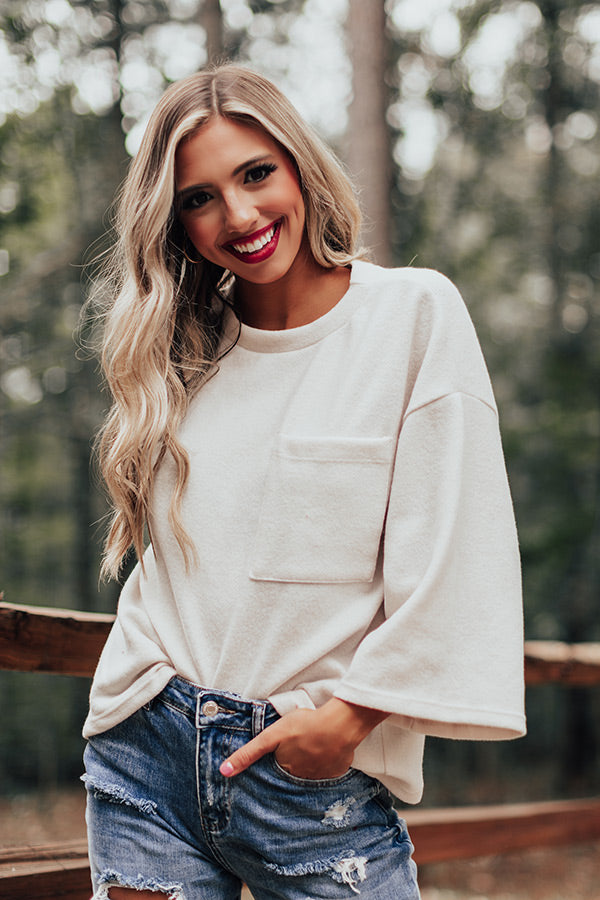 Keep it simple but significant in our casual cute cream colored "Cabin Live Sweatshirt" featuring ultra soft lightweight material, a high rounded neckline, loose 3/4-length sleeves, a single accent chest pocket, and a relaxed silhouette that falls into a straight hemline! Measurements