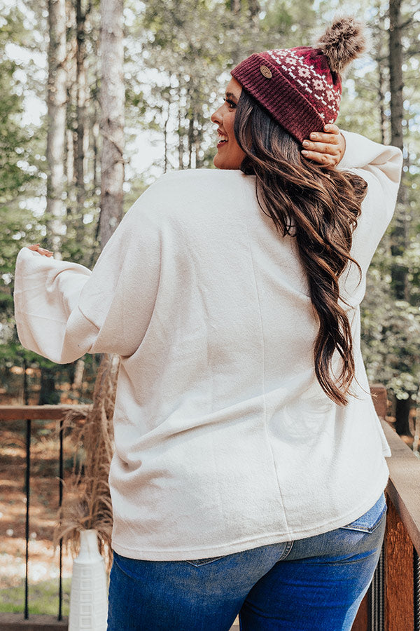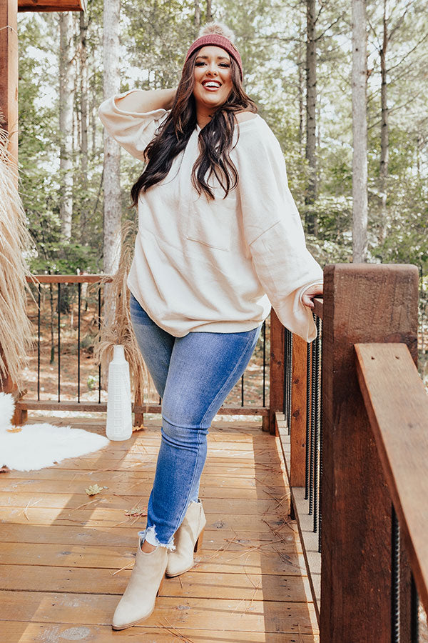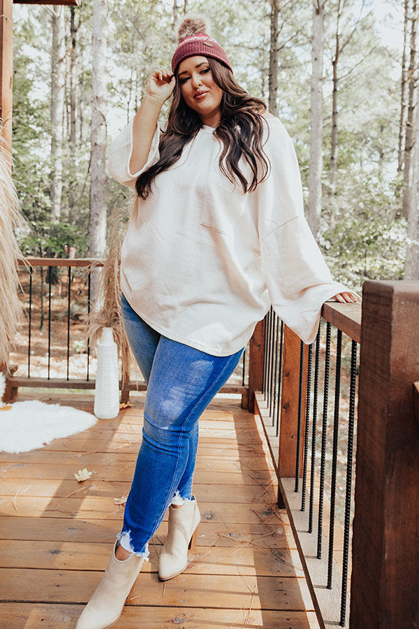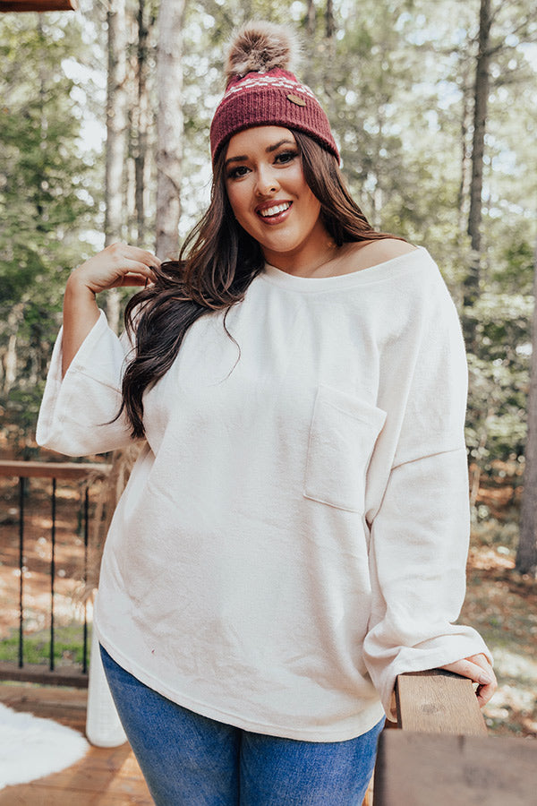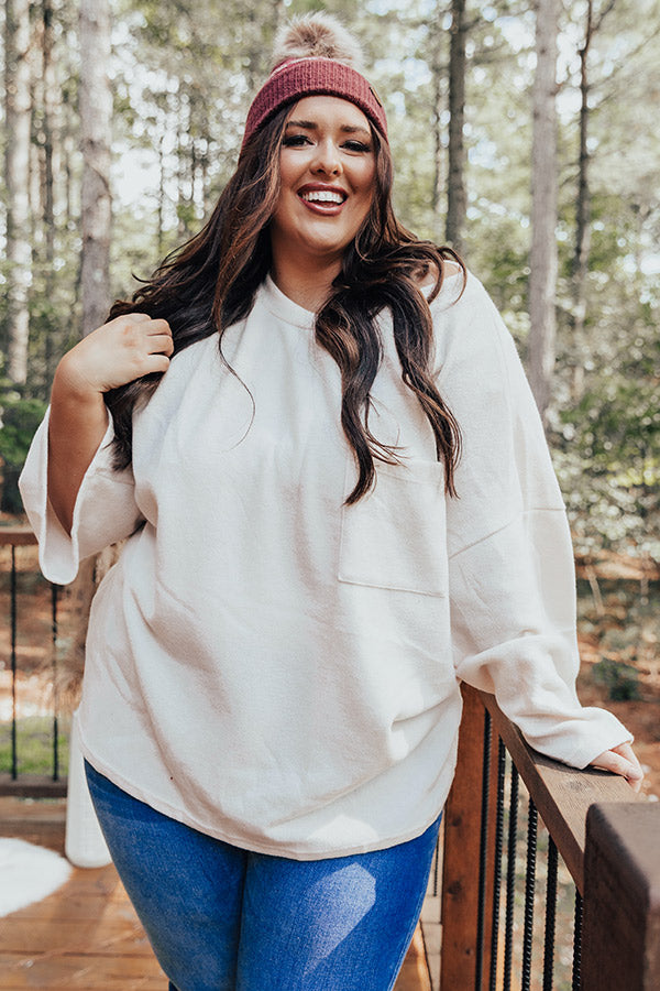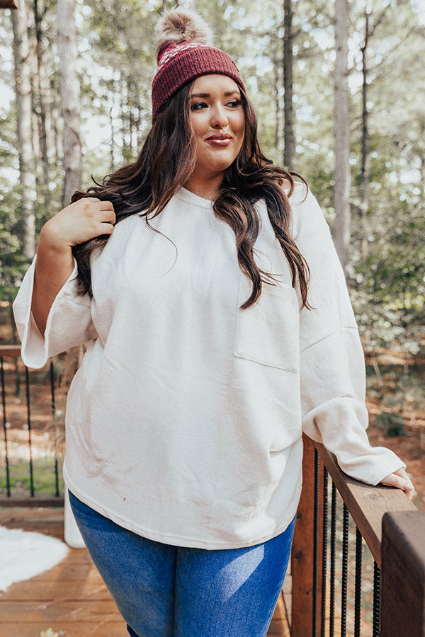 Plus Size - Keep it simple but significant in our casual cute cream colored "Cabin Live Sweatshirt" featuring ultra soft lightweight material, a high rounded neckline, loose 3/4-length sleeves, a single accent chest pocket, and a relaxed silhouette that falls into a straight hemline! Measurements