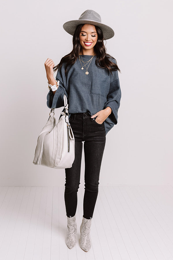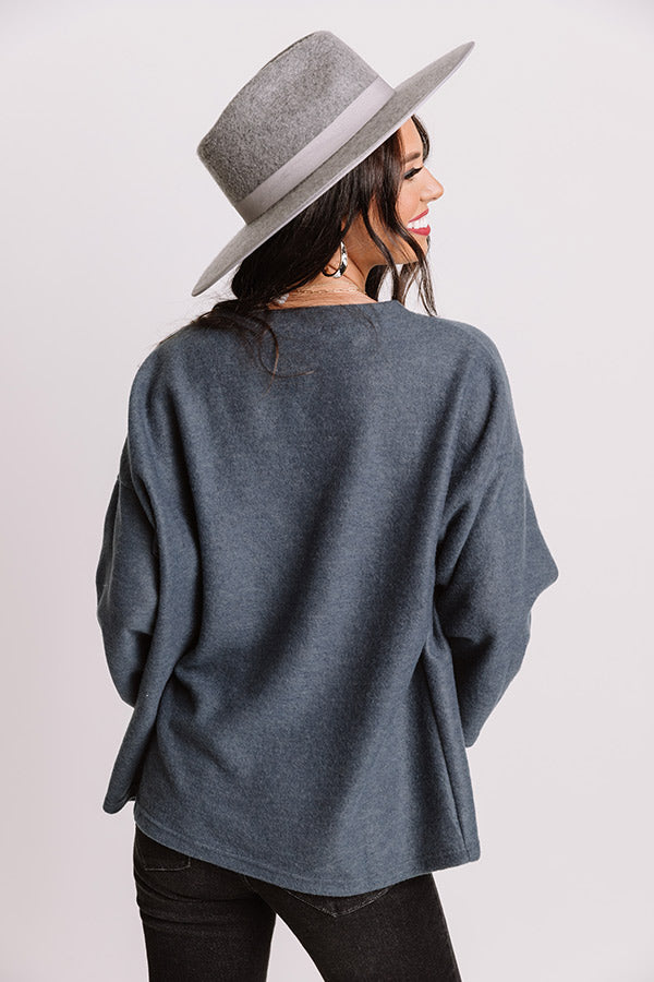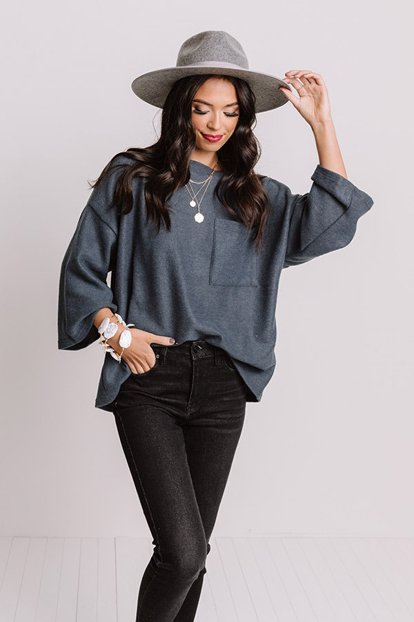 Keep it simple but significant in our casual cute dark slate colored "Cabin Live Sweatshirt" featuring ultra soft lightweight material, a high rounded neckline, loose 3/4-length sleeves, a single accent chest pocket, and a relaxed silhouette that falls into a straight hemline! Measurements
