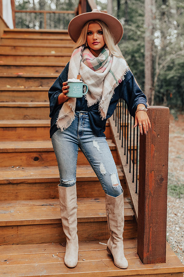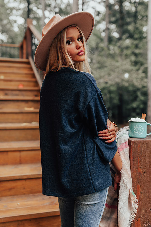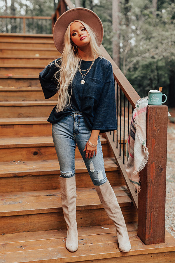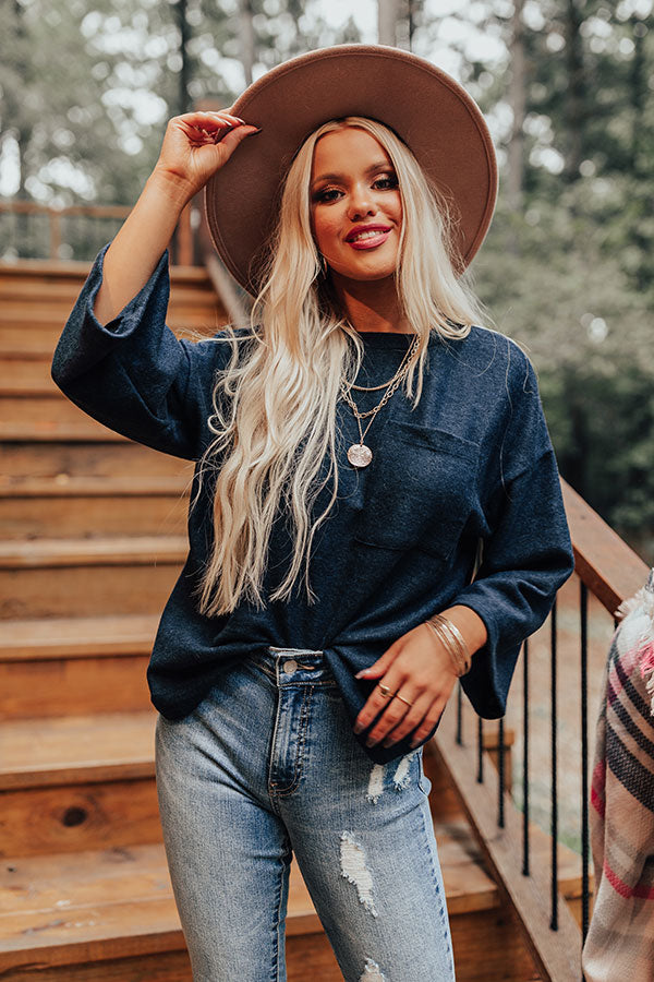Keep it simple but significant in our casual cute navy colored "Cabin Live Sweatshirt" featuring ultra soft lightweight material, a high rounded neckline, loose 3/4-length sleeves, a single accent chest pocket, and a relaxed silhouette that falls into a straight hemline! Measurements
