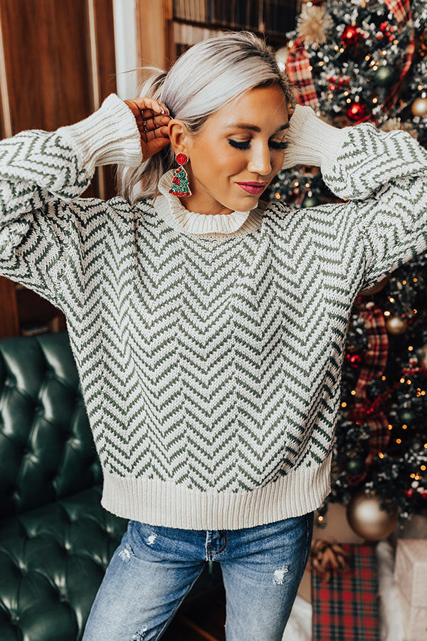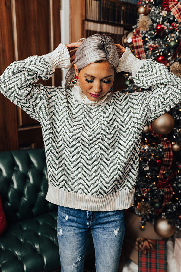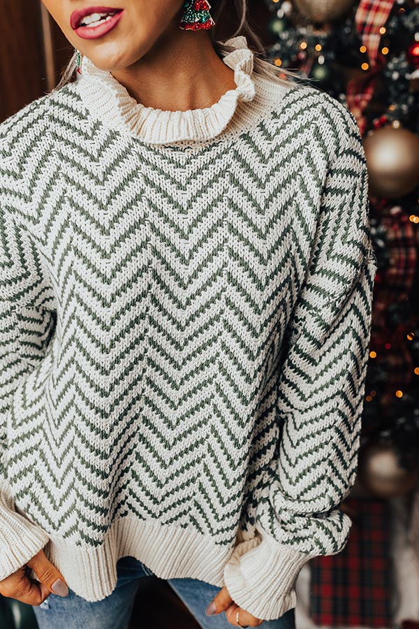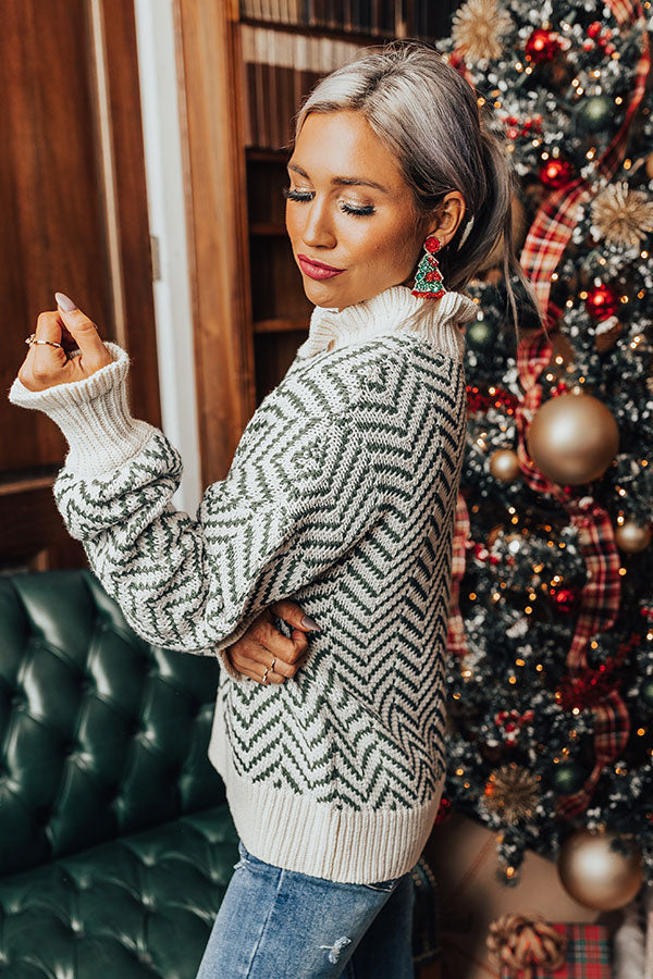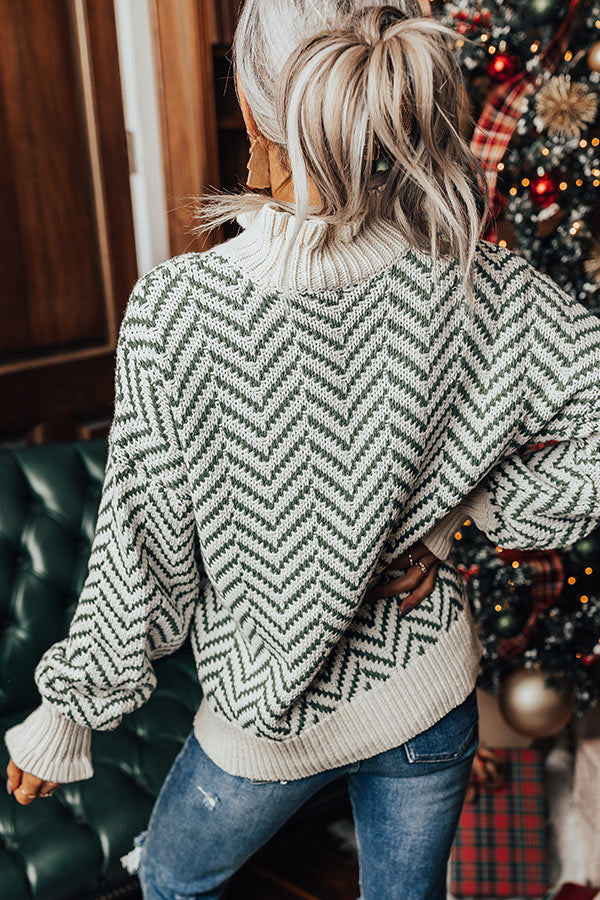 Slay the holidays with our darling 'Cabin Meetup' sweater featuring warm knit material patterned with green zigzag stripes, long loose sleeves with subtle flared cuffs, a ruffled turtle neckline, and a slouched silhouette that falls into a straight hemline! Measurements