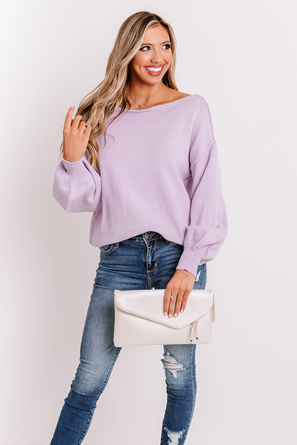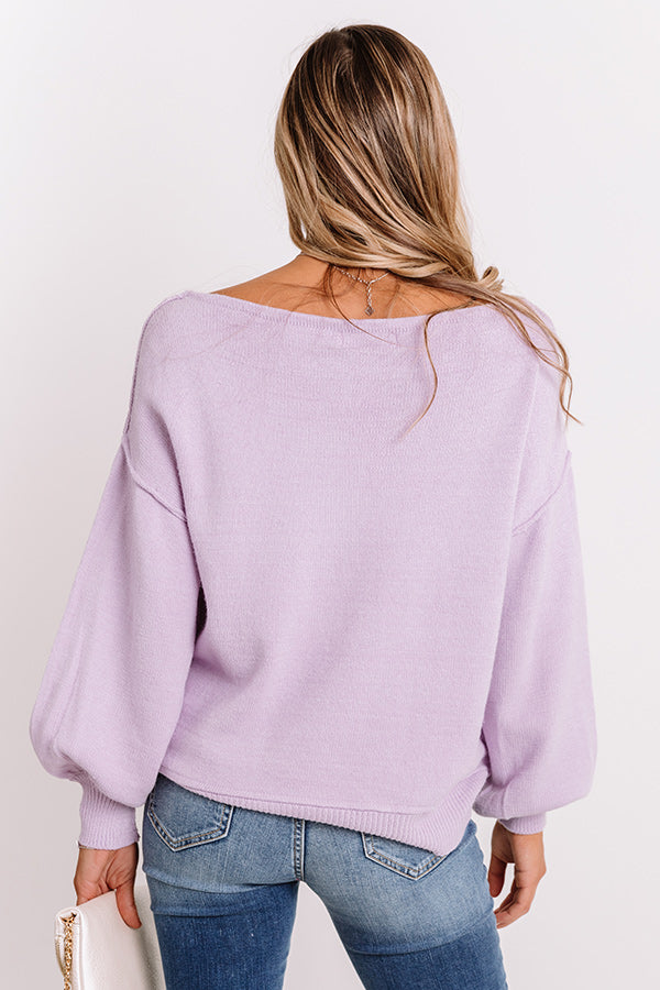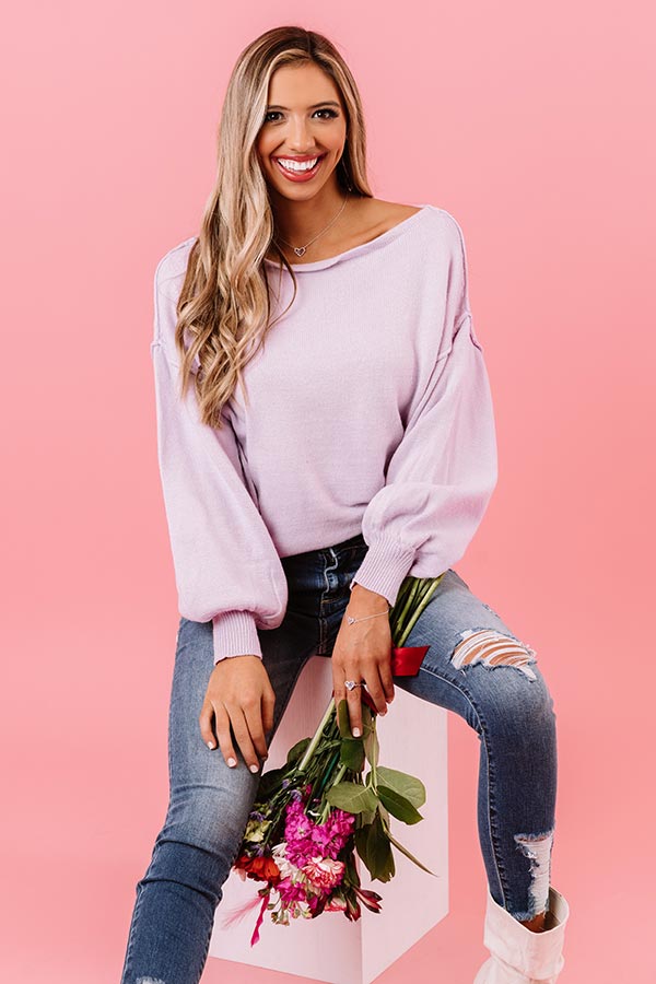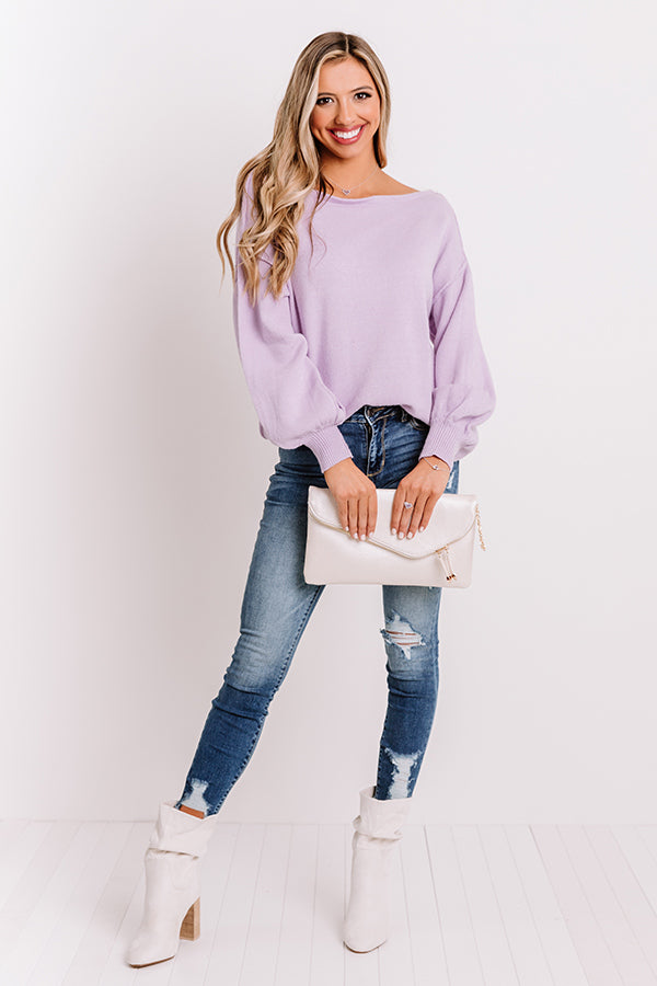 You won't find a warmer or more stylish piece to wear for a cabin vacay than this adorable lavender colored sweater featuring ultra soft tight knit material, a wide rounded neckline that can be worn off one shoulder, long oversized sleeves with fitted cuffs, ribbed trim detailing, and a relaxed silhouette that falls into a straight hemline! Measurements