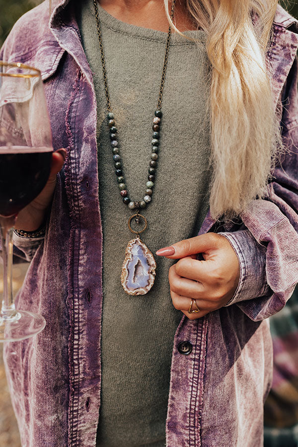 Heads are sure to turn your way when you accessorize with our beautiful 'Cabinside Sips' necklace featuring a long vintage bronze chain with dark earthy hued bead accents and an oversized lavender colored druzy stone pendant! Due to the natural stone there may be some variations in color, shape or size.