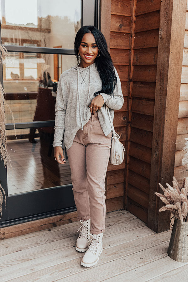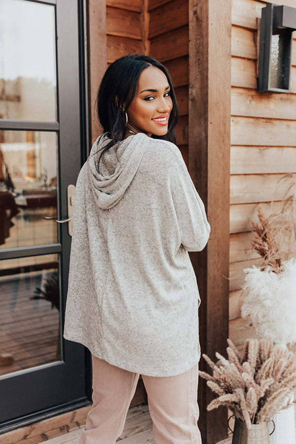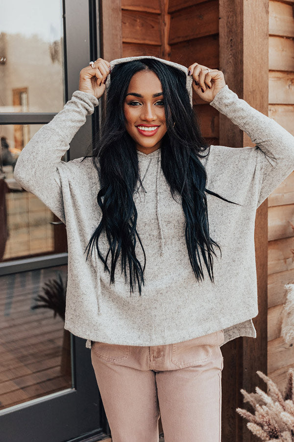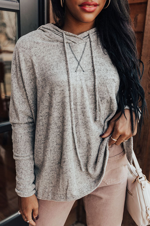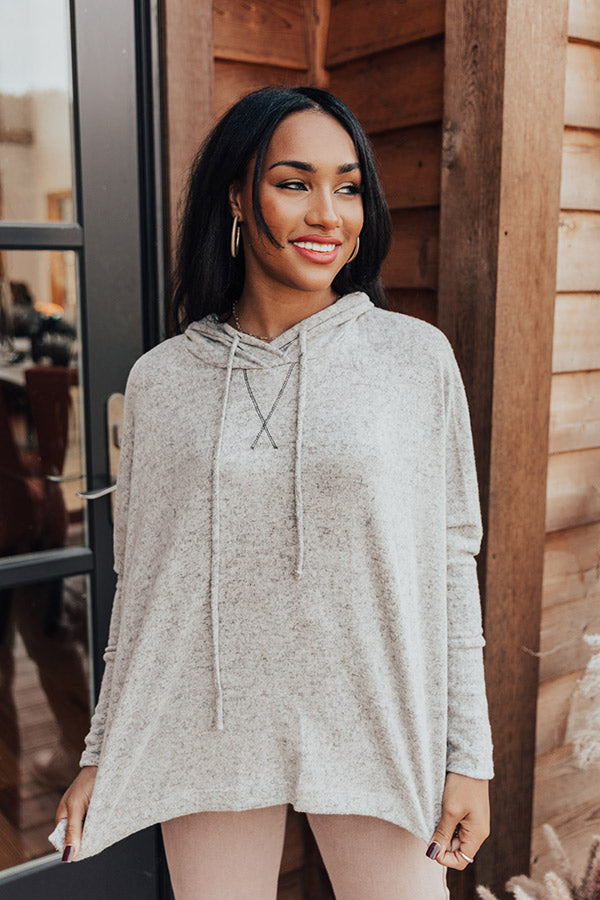 Sip your morning coffee or cocoa in comfort with this cozy grey hued hoodie featuring soft lightweight material, a high neckline with a drawstring hooded back, long loose sleeves, and a slouched silhouette that ends in a straight hemline!