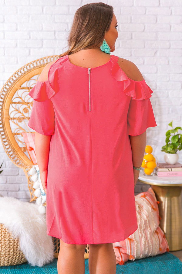 Cabo kisses are everyones wishes! This sassy shift dress features a breezy chiffon bodice, ruffle accented open shoulders & an exposed back zipper that will make getting dressed a breeze!