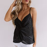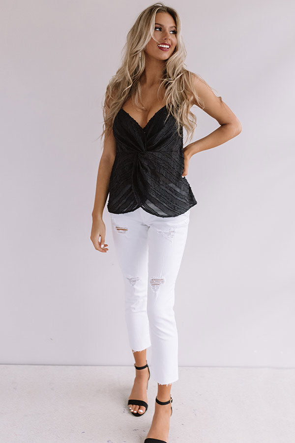 You are sure to be a cutie when you wear this adorable black tank featuring ultra lightweight material patterned with diagonal stripes, a twisted front detail, a v-cut neckline with adjustable spaghetti straps, and a relaxed silhouette that falls into an uneven hemline! We have styled this basic beauty with some distressed white skinnies and matching black heels, but you can also wear it layered under our "Insider Chic Camo Cardigan" with "The Brighton Espadrille in Grey," and our "All Caught Up Headband in Grey!" Measurements