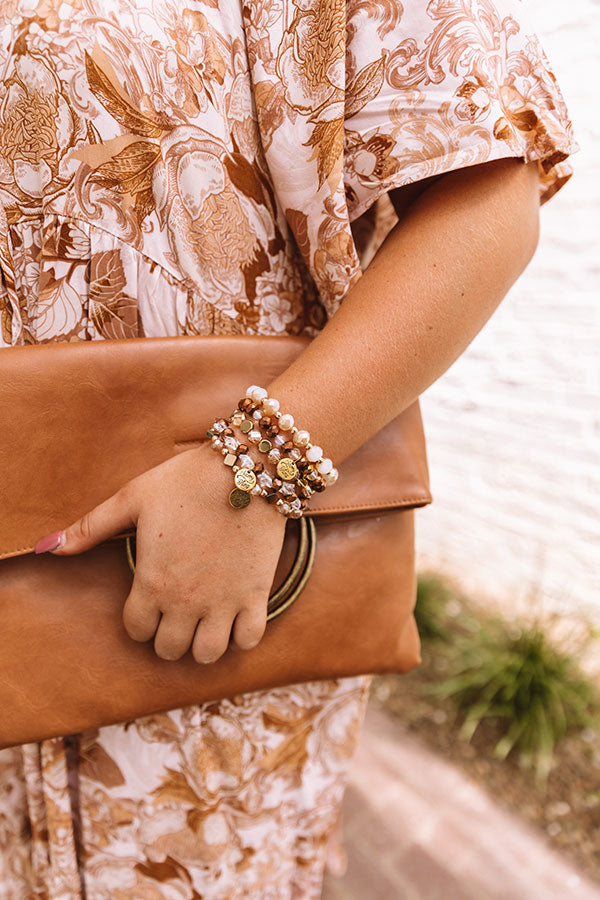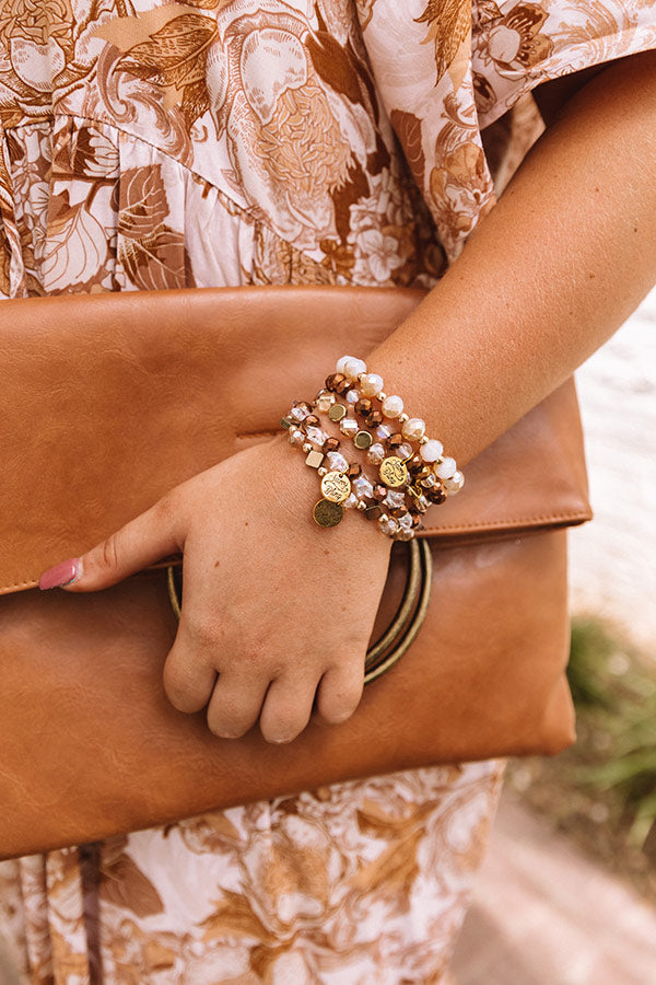 Keep your accessory style cool but cute with this adorable set of five bracelets featuring various brown hued beaded stretch pieces finished with gold tags!