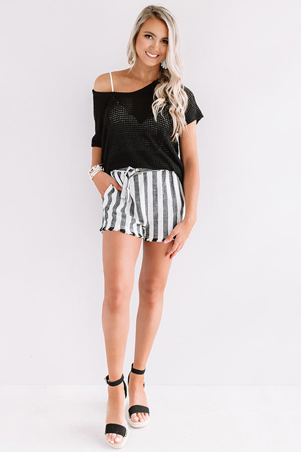 You are sure to be someone's secret crush when you wear this chic black top featuring lightweight semi-sheer material with waffle knit texturing, a wide v-cut neckline that can be worn off one shoulder, short loose sleeves, and an ultra relaxed silhouette that falls into a rounded hemline! You can style this basic piece a variety of ways, like with a bralette, striped shorts, and black wedges, but you can also wear it layered under a distressed denim jacket with some distressed white skinnies, our "Neutral Territory Snake Print Tote in Black," and "The Tory Snake Print Heel!" Measurements