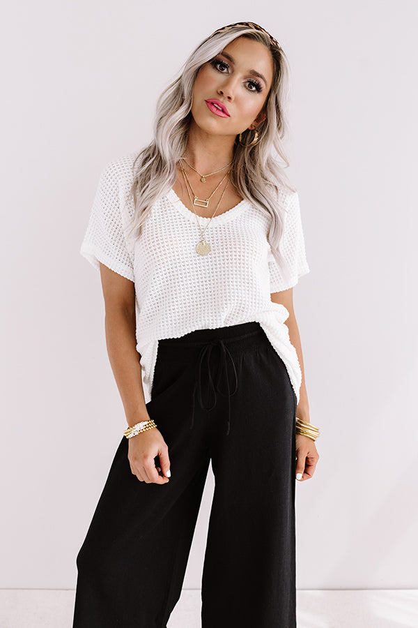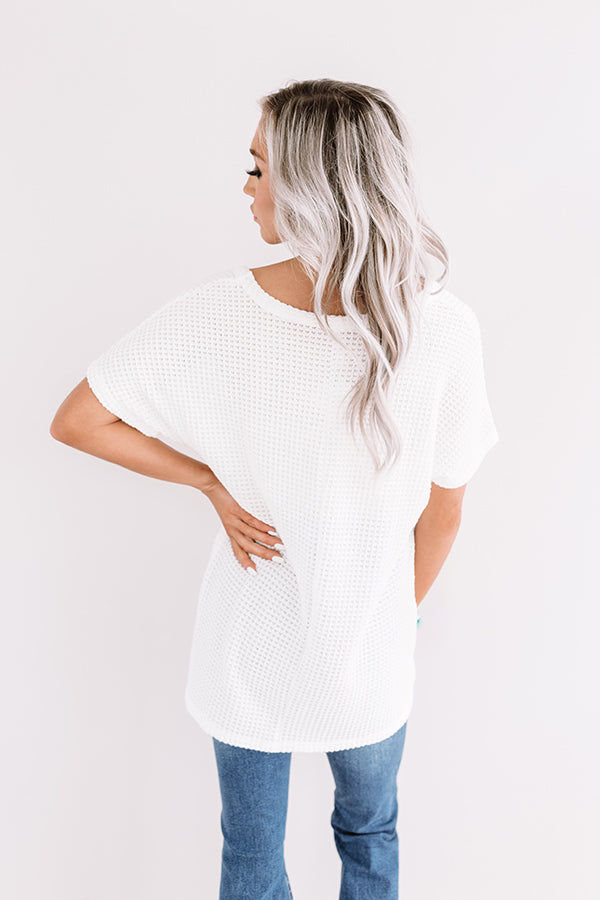 You are sure to be someone's secret crush when you wear this chic white top featuring lightweight semi-sheer material with waffle knit texturing, a wide v-cut neckline that can be worn off one shoulder, short loose sleeves, and an ultra relaxed silhouette that falls into a rounded hemline! You can style this basic piece a variety of ways, like with some distressed ankle skinnies or black pants and a trendy leopard sneaker and headband, but you can also wear it layered under a grey cardigan with some frayed denim shorts, "The Allen Wedge in Snake Print," and our "Nightlife Luxury Snake Print Tote in White! Measurements