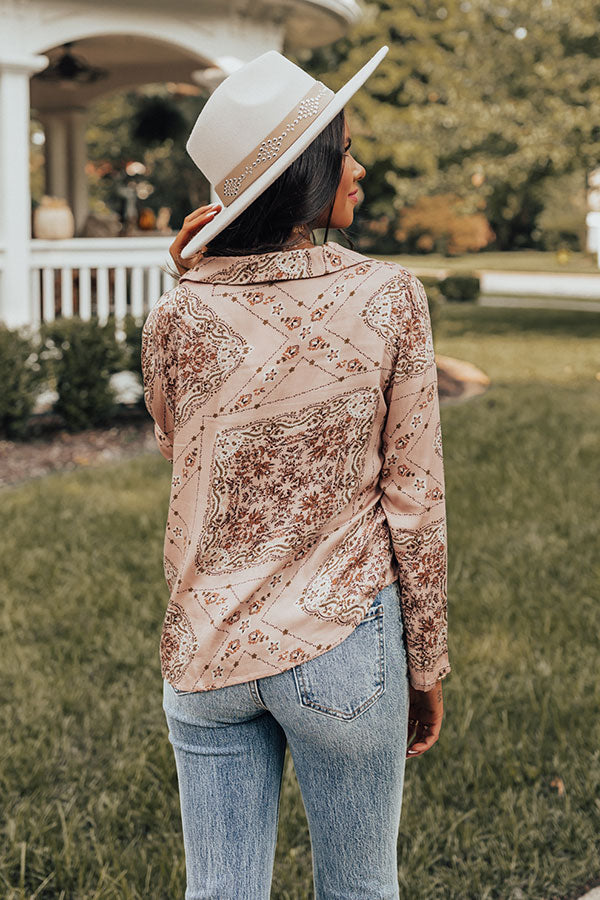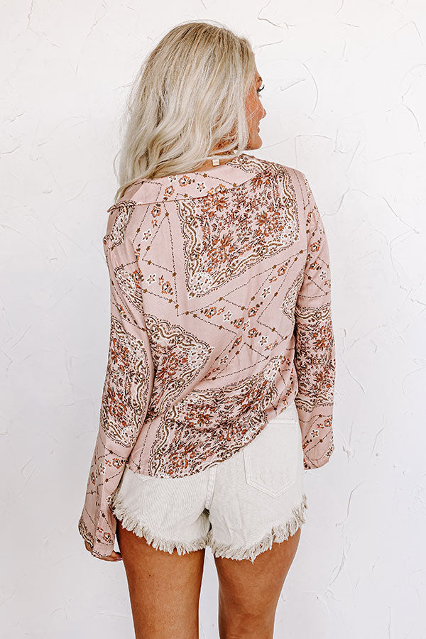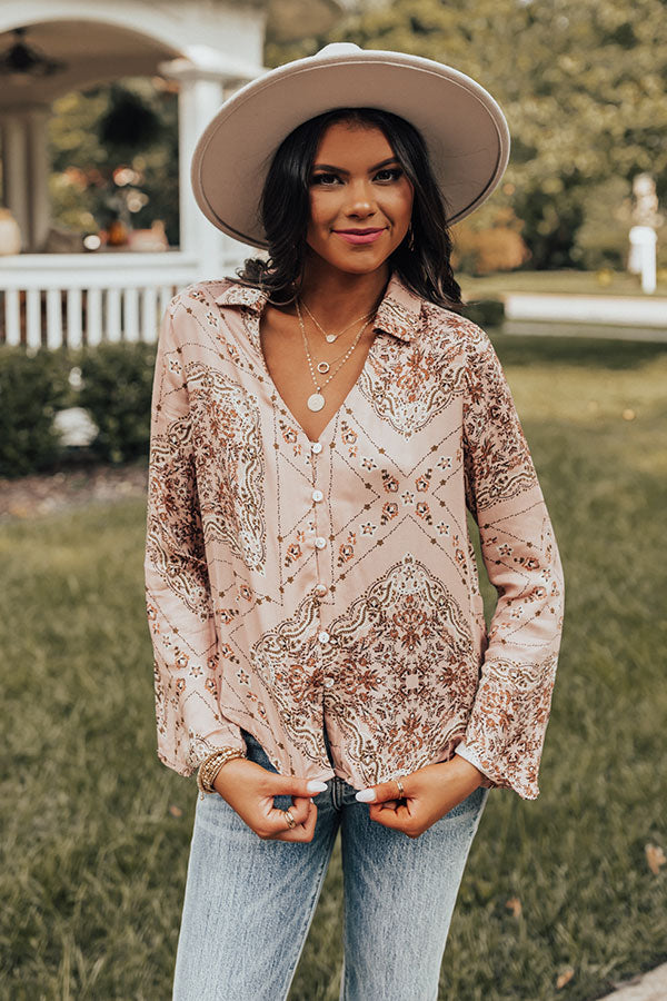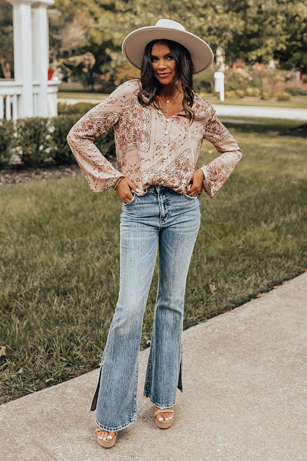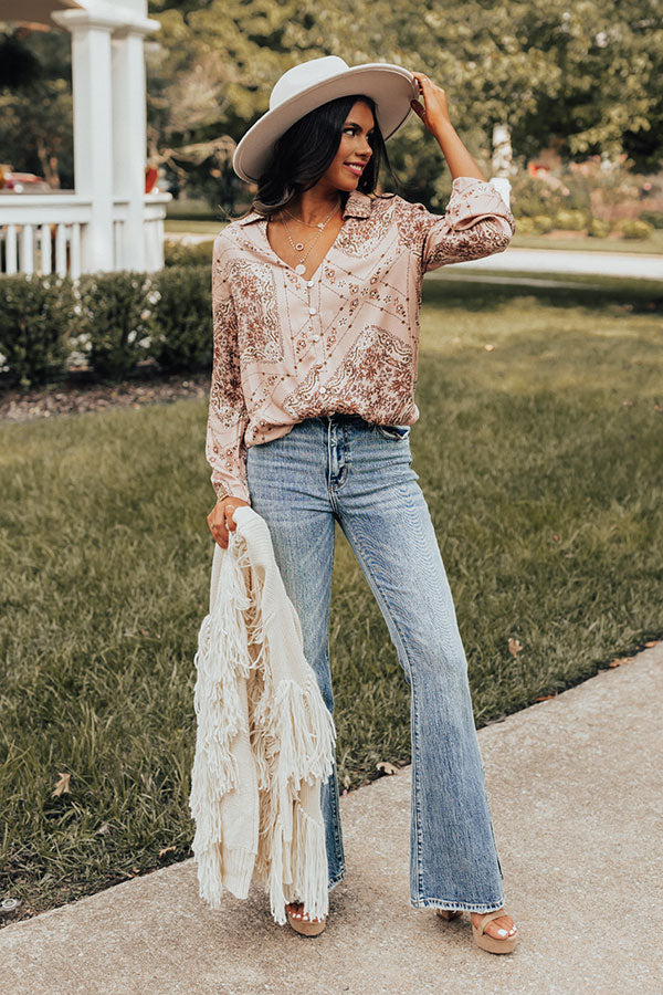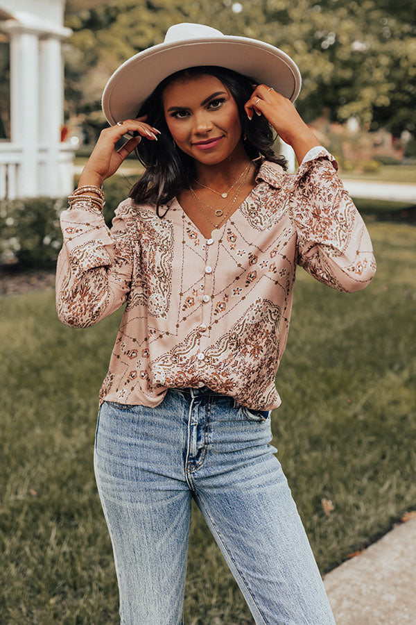 Get fall date night ready with this beautiful iced latte hued shift top featuring lightweight material patterned with a pretty floral print, a button down front with a collared neckline, long loose sleeves with flared cuffs, and a relaxed silhouette that falls into a straight hemline!